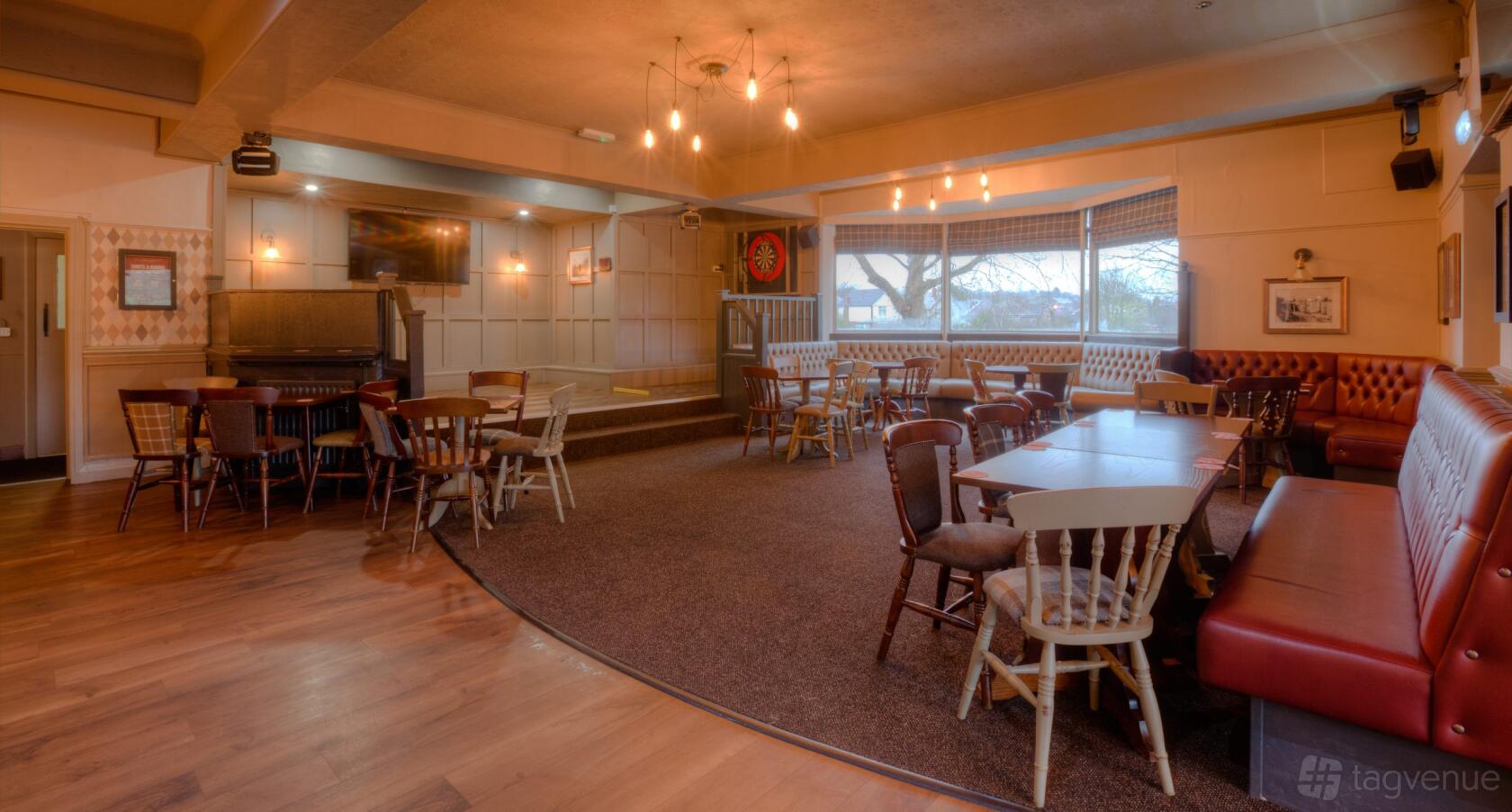 The Function Room at The Red Admiral is a versatile and inviting space, perfect for a variety of events. The room features a combination of wooden flooring and carpeted areas, creating a warm and cozy atmosphere. Seating arrangements include tables with chairs and booths with red upholstered seats along the wall, providing comfortable options for guests. The space features 2 flat screen TV's and a bar access.