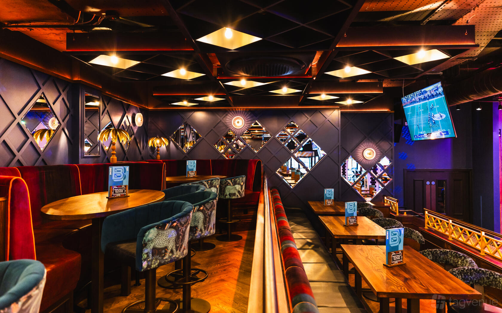 The Stadium is located towards the back of our venue and is over 2 rows of tables. This semi-private space can be roped off so that only your party have access. It can hold a maximum of 60 guests seated and up to 80 standing, making it a great space for bigger parties.
