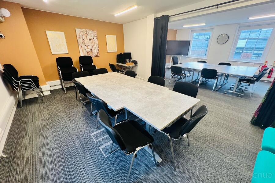 The hire fee includes several amenities for your convenience, such as complimentary tea, coffee, and jugs of water. You'll also have access to a flat-screen TV and AV equipment. In addition, there's a kitchenette available for your use, equipped with a fridge and microwave.