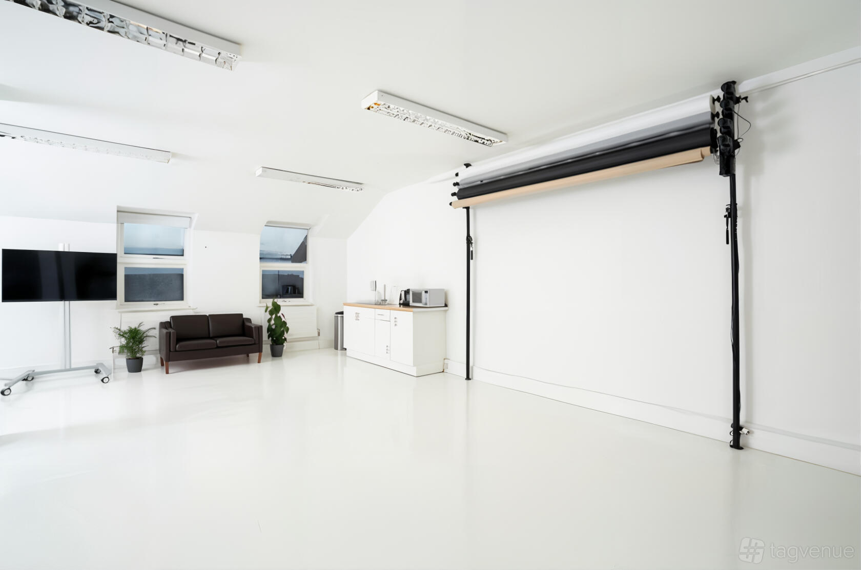 This spacious, naturally lit, 70m² space is equipped with a full Profoto lighting kit, green screen and solid colour Colorama backdrops.