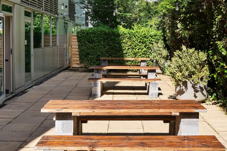A bright boardroom with HDMI-compatible AV and ClickShare, featuring natural daylight and direct access to an outdoor patio. Ideal for meetings or presentations, it accommodates up to 10 guests in a boardroom setup, providing a productive and refreshing environment.