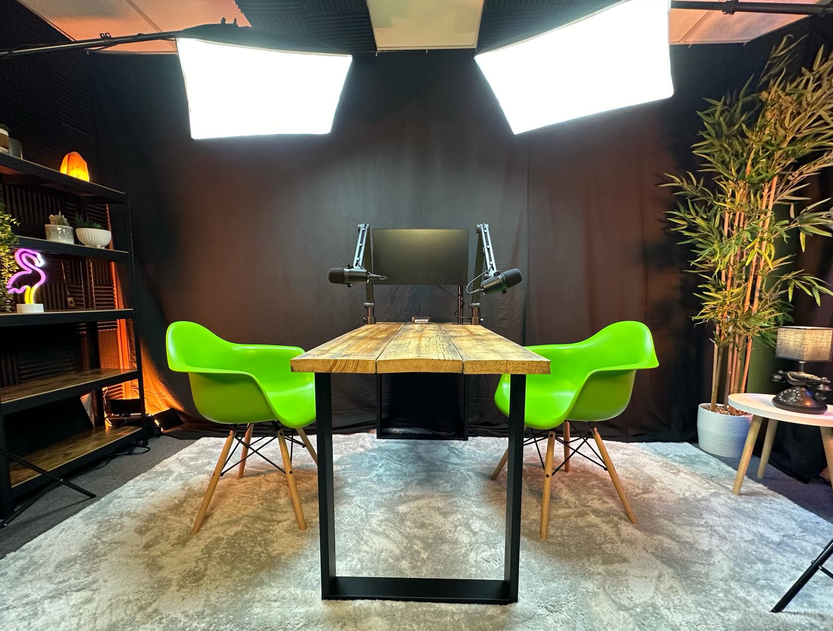 Halton Podcast Studios offers a versatile and professional space perfect for content creation. The studio features stylish seating options, including bright green and yellow chairs, set against a modern backdrop with high-quality lighting and soundproofing. The setup is ideal for interviews, podcasts, and video recordings, providing a comfortable yet professional atmosphere.