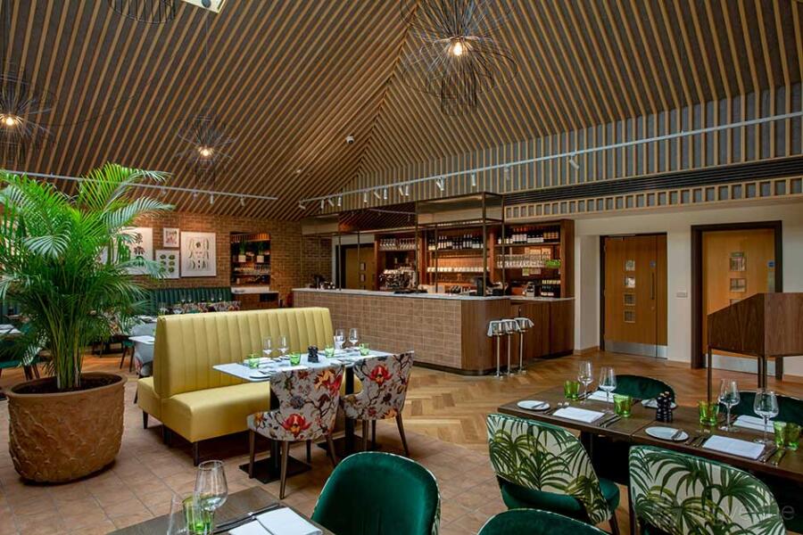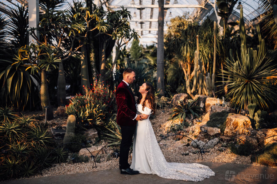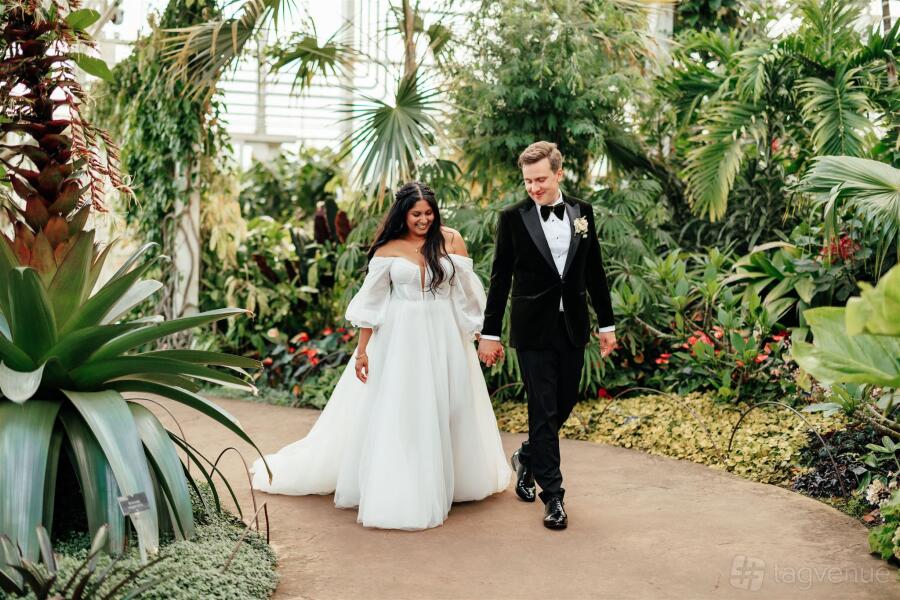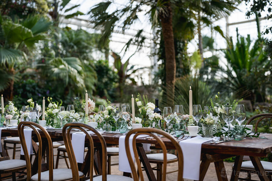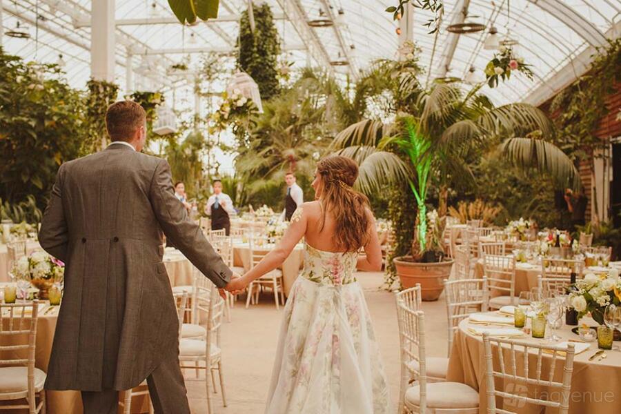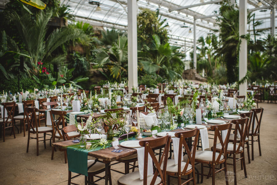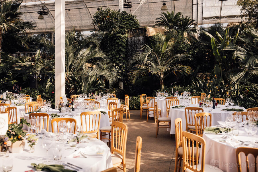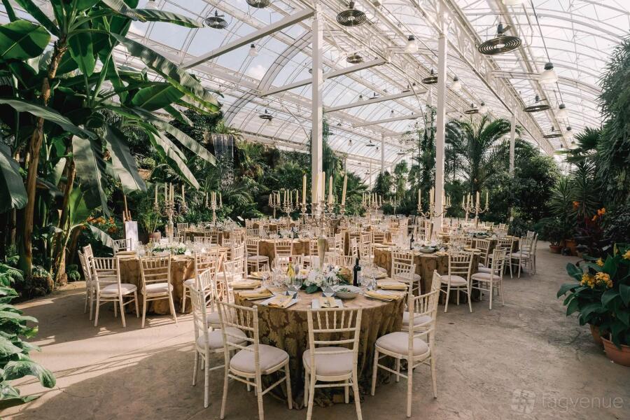 The venue includes the Glasshouse, featuring tropical plants and a waterfall, and the Hilltop Garden Room, a space surrounded by three gardens.