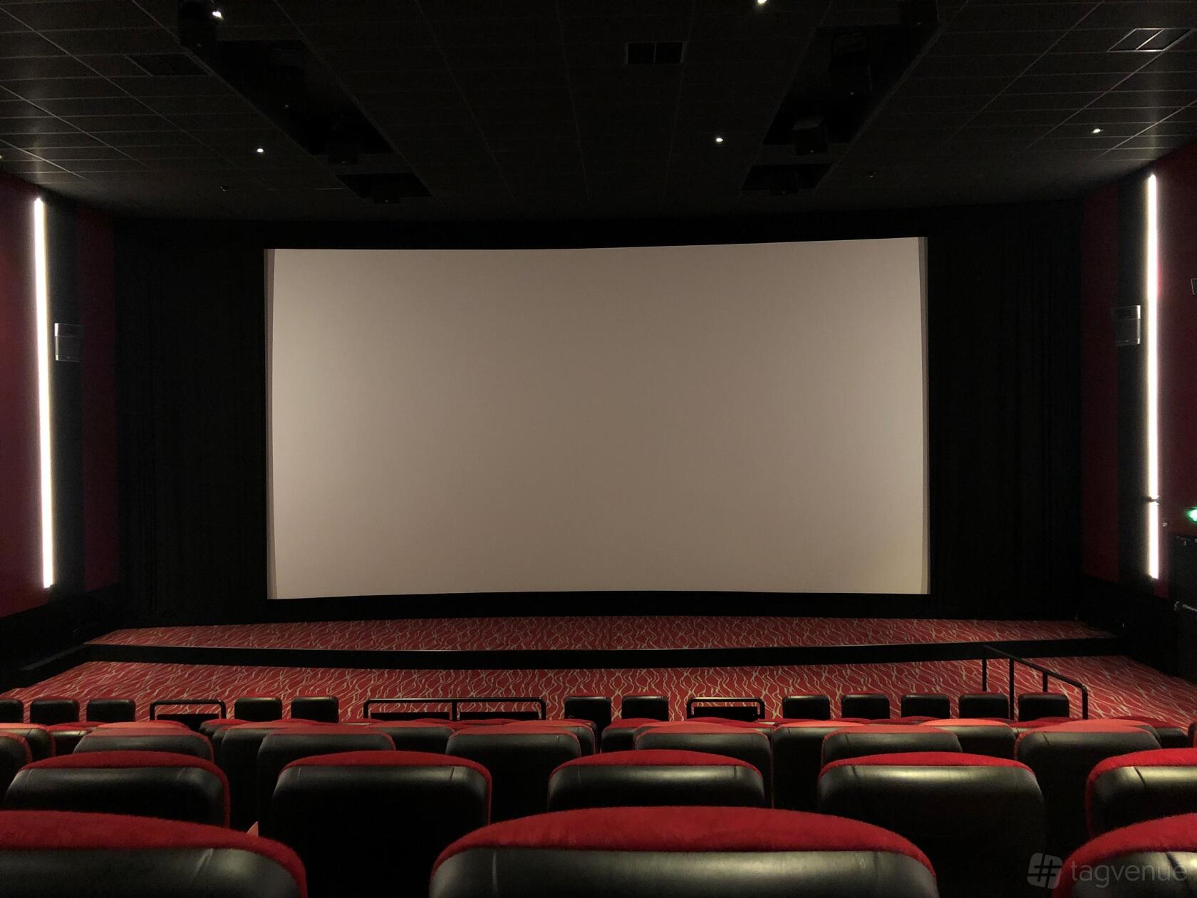 A spacious auditorium with red seating and excellent sightlines. High-quality audiovisual technology ensures clear picture and immersive sound. Ideal for private screenings, corporate events, or presentations. Sleek red and black decor creates a professional yet comfortable atmosphere. Accessible seating and well-lit pathways add convenience.