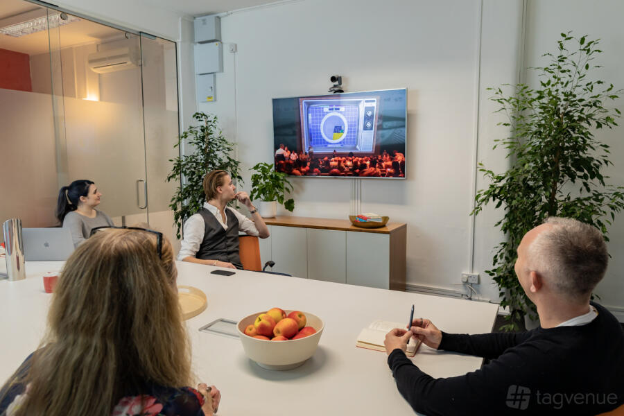 The room includes a HD screen with ClickShare, video conferencing, high-speed WiFi, and a flipchart with pens. We also offer hot drinks, 24-hour CCTV, and on-site support staff, with catering and parking available as well.