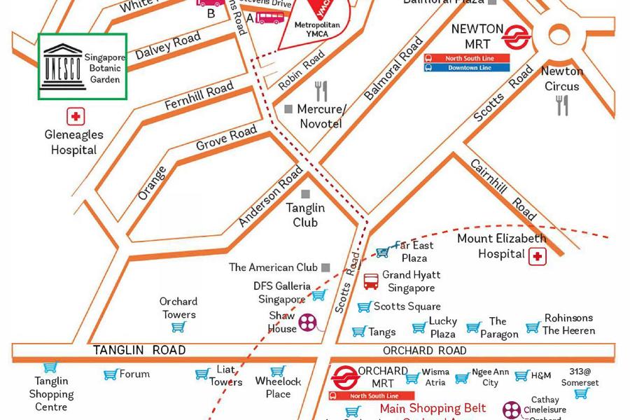 Metropolitan YMCA Singapore is an exclusive enclave situated along Stevens Road, close to the vibrant ambiance of Singapore lively Orchard shopping and entertainment hub. It is surrounded by lush greenery adjacent to the renowned Botanic Gardens and within proximity to Singapore's business district at Shenton Way.