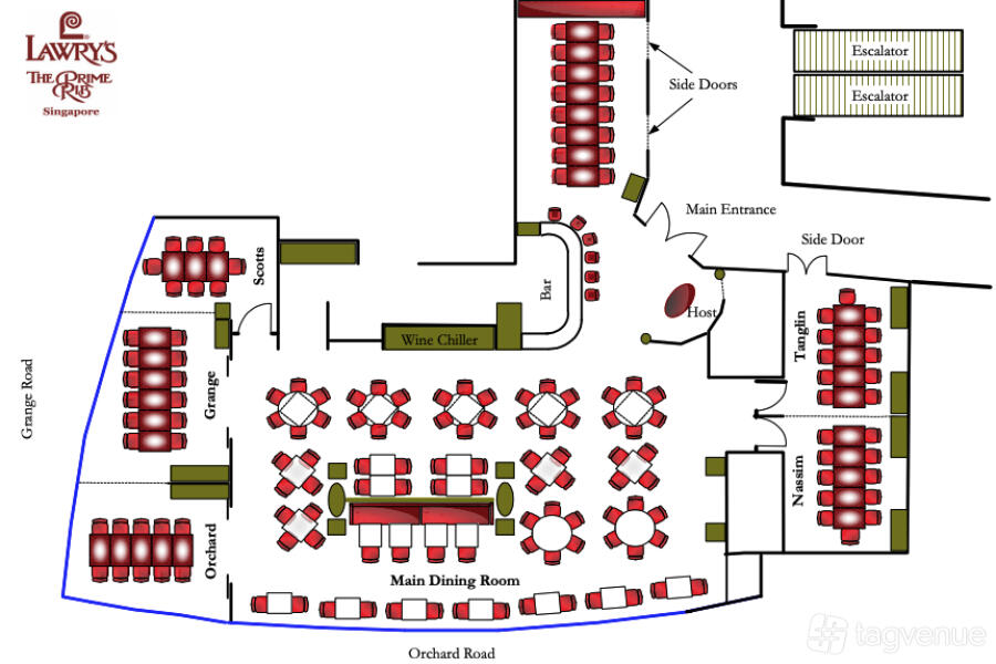 Relocated from The Paragon in 2010, Lawry’s The Prime Rib Singapore resides on the fourth floor of Mandarin Gallery with 6,500 square feet of prime retail space, accommodating a seating capacity of 160. The new Lawry’s exudes an air of opulence with its sleek interpretations of luxury. Guests will be treated to the sweeping view of Orchard Road cityscape through 4-metre high floor-to-ceiling windows.