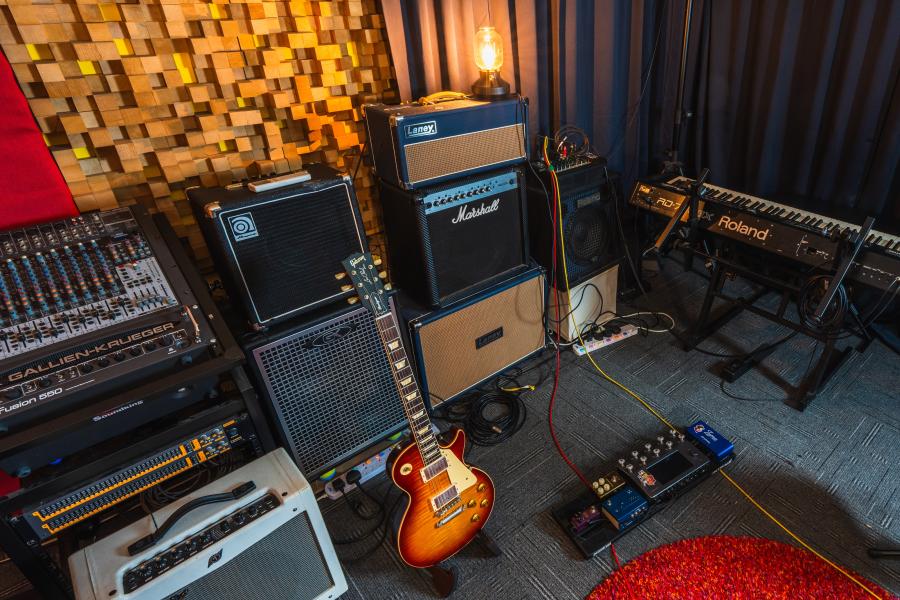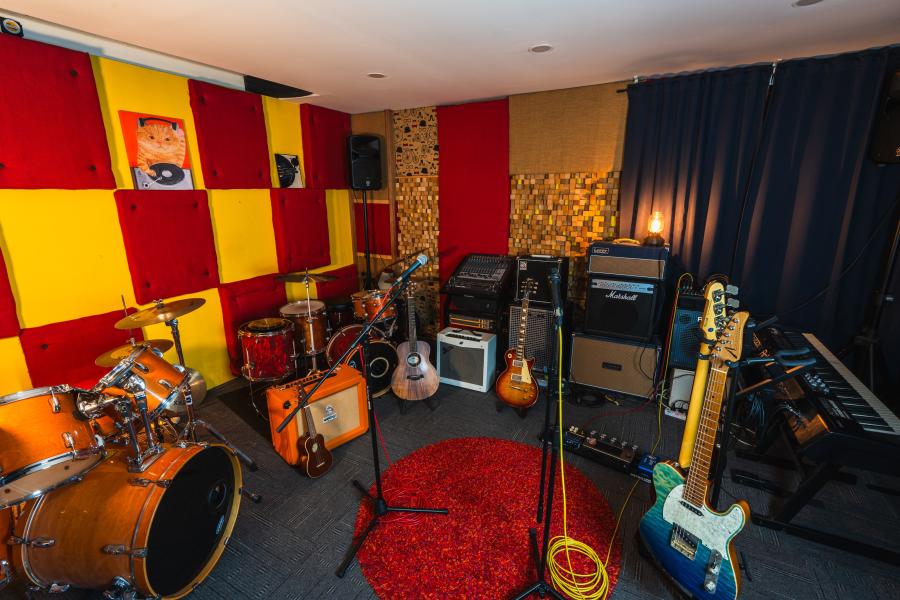 A professionally equipped studio designed for your recording, rehearsal and jamming needs at affordable rates. With its homely and functional design, our live room comfortably fits 15-20 people and is perfect for group workshops, lessons, and small-scale concerts.