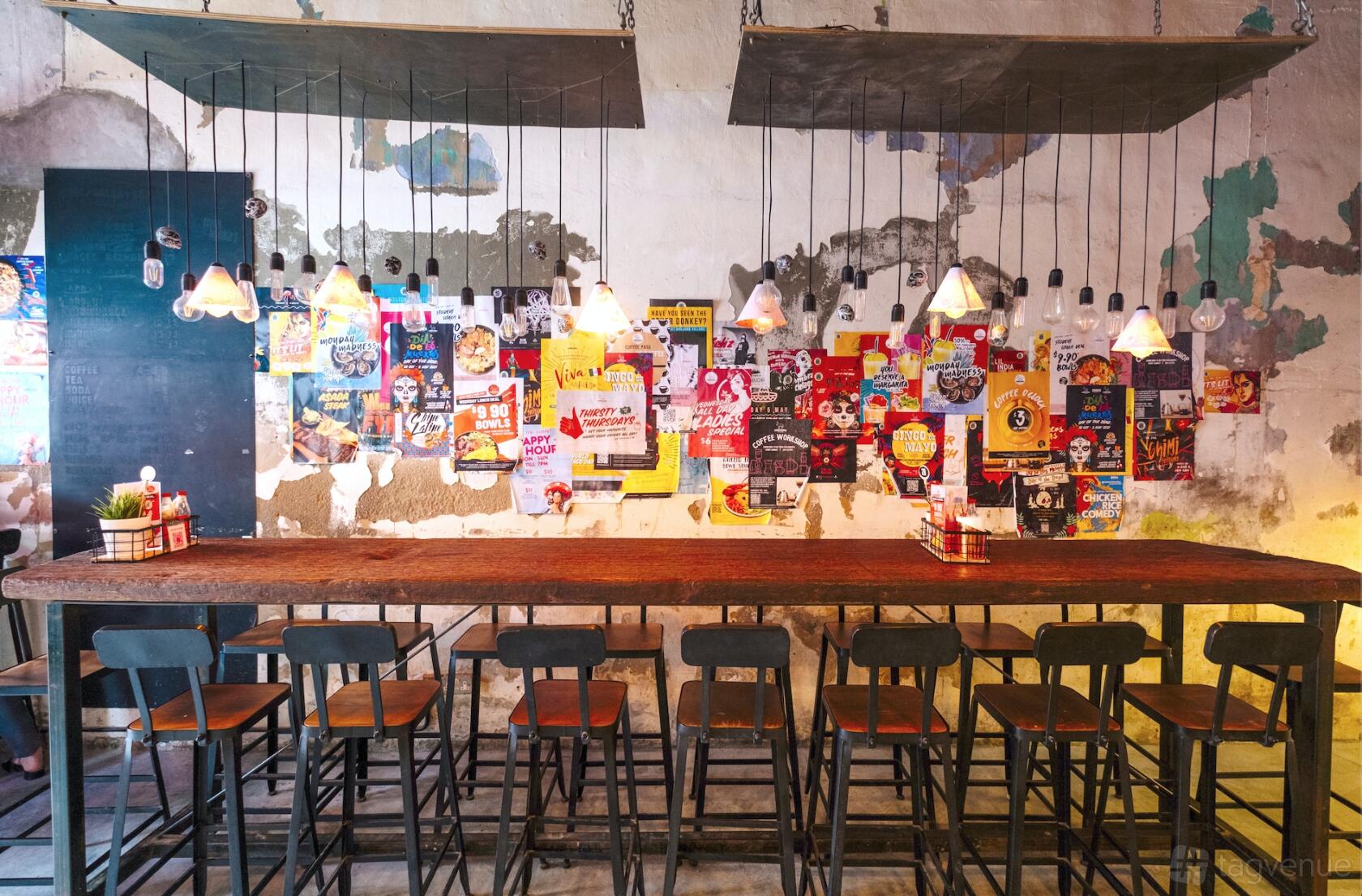 Envision a striking 16-seater table, expertly fashioned from reclaimed pontoon planks. Its backdrop features a vibrant collage of posters on a wall, narrating the diverse tapestry of events and promotions from our lively history.