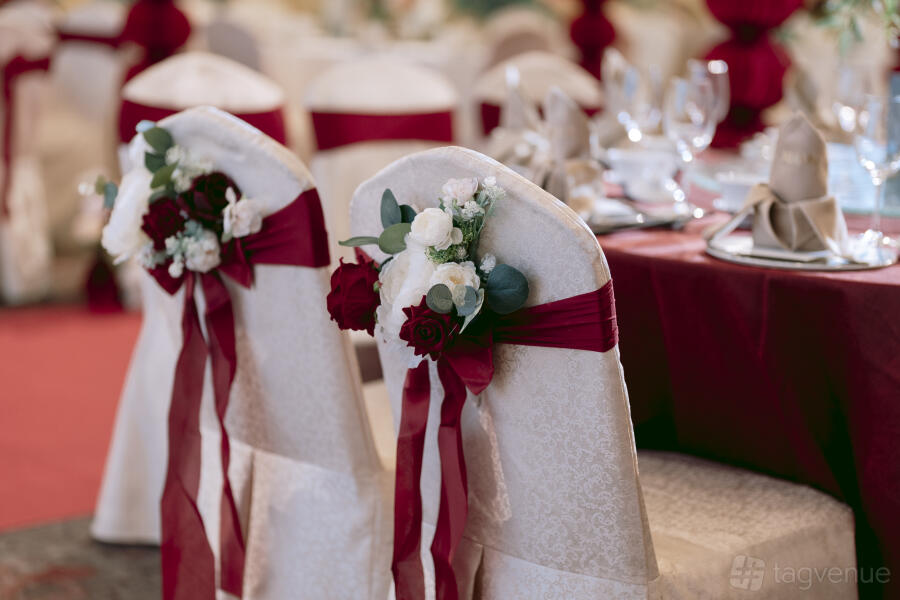 Adorned with tasteful decor, the room exudes sophistication and charm. Tables and chairs are arranged with precision, creating an inviting ambiance for guests to mingle and enjoy the festivities. Each table is meticulously set with fine linens and stylish centerpieces, while the chairs offer both comfort and style.