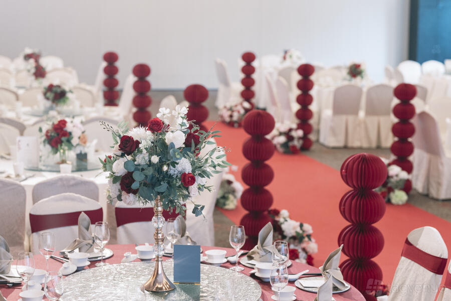 Soft, ambient lighting enhances the atmosphere, casting a warm glow throughout the room. Whether hosting an intimate affair or a grand celebration, Hall B provides ample space for guests to socialize and create lasting memories.