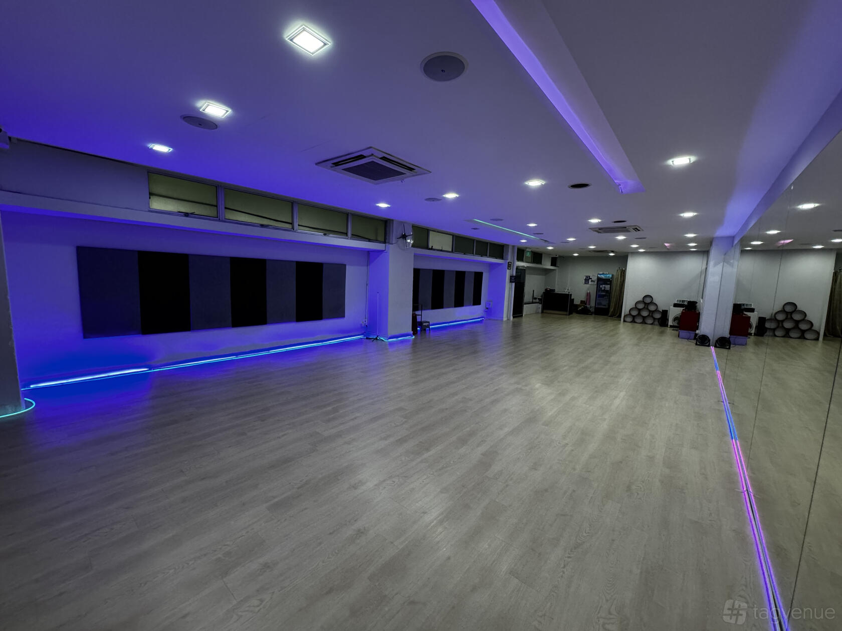 As you step inside, you’ll be greeted by a light-filled, open space. Mirrored walls stretch from floor to ceiling. The wooden floor provides a comfortable surface for dynamic movements, whether you’re dancing, doing pilates, or sweating it out in a Zumba class. Our studio comes alive with a combination of white ceiling lights and blue accents along the mirror edges. The lighting sets the mood for energetic workouts, making every session feel like a celebration.