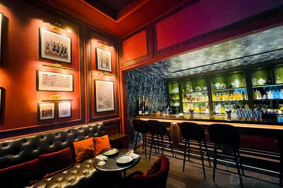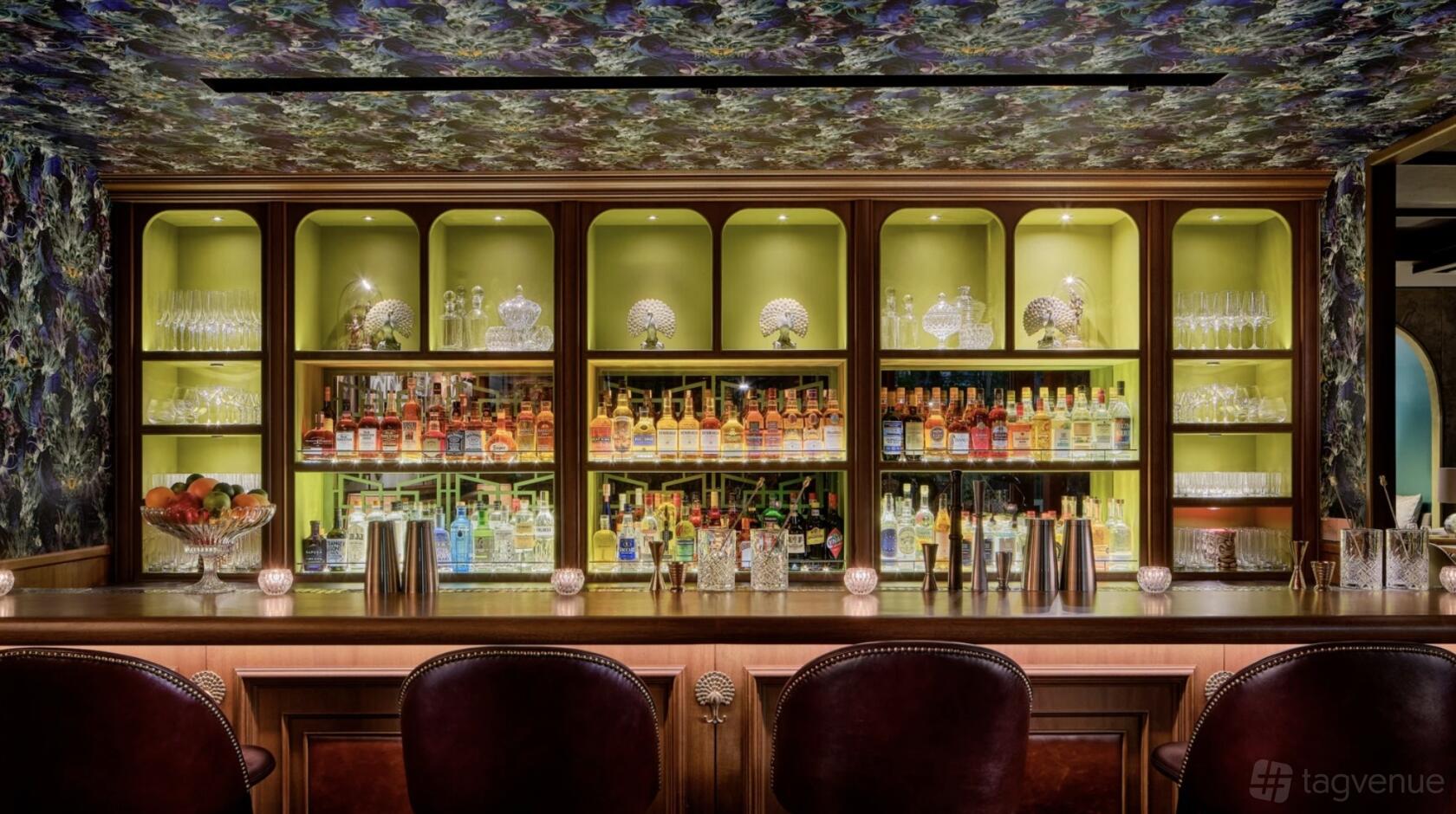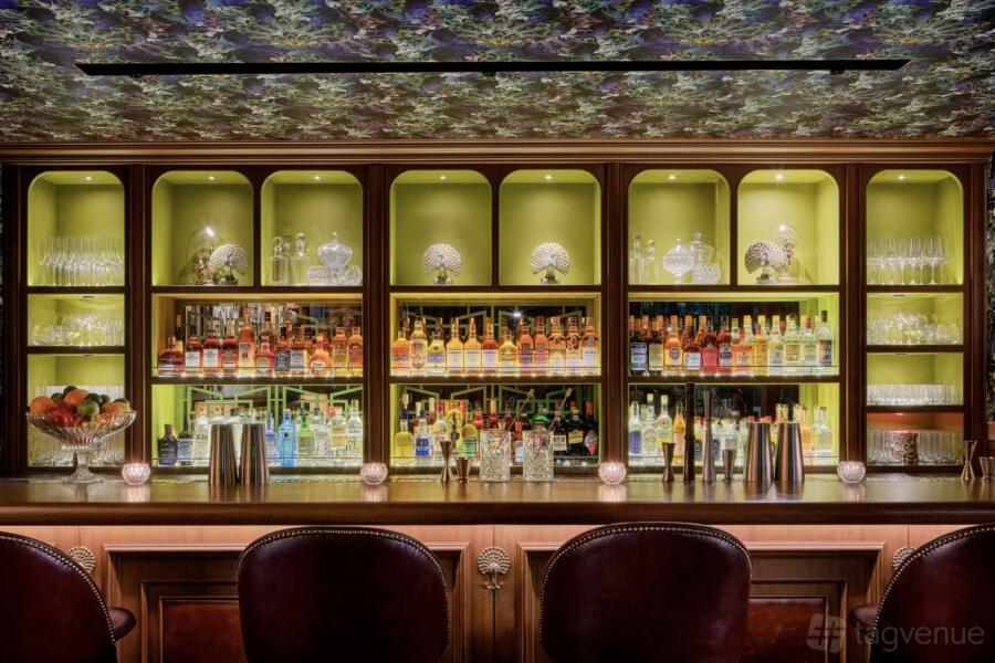 The bar area is a central feature, with shelves lined with a variety of bottles. The overall design balances an old-world charm with modern comforts. The attention to detail in the decor and layout helps create an inviting yet exclusive setting.