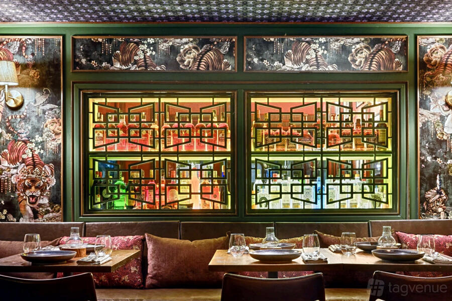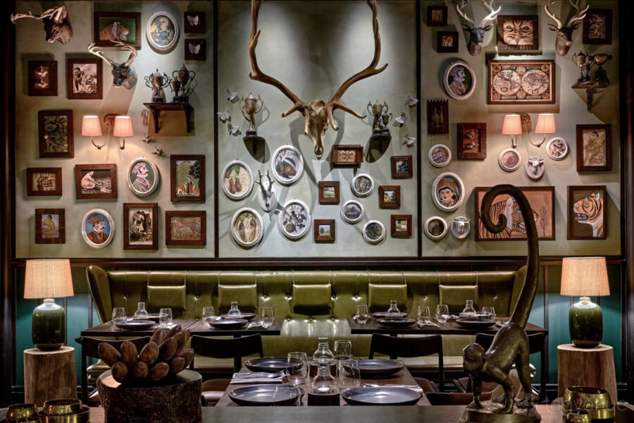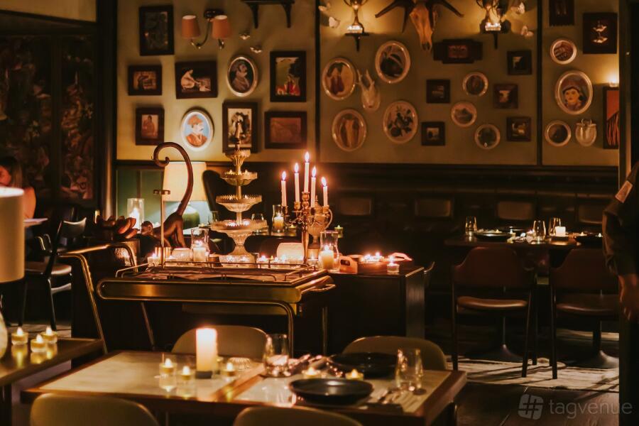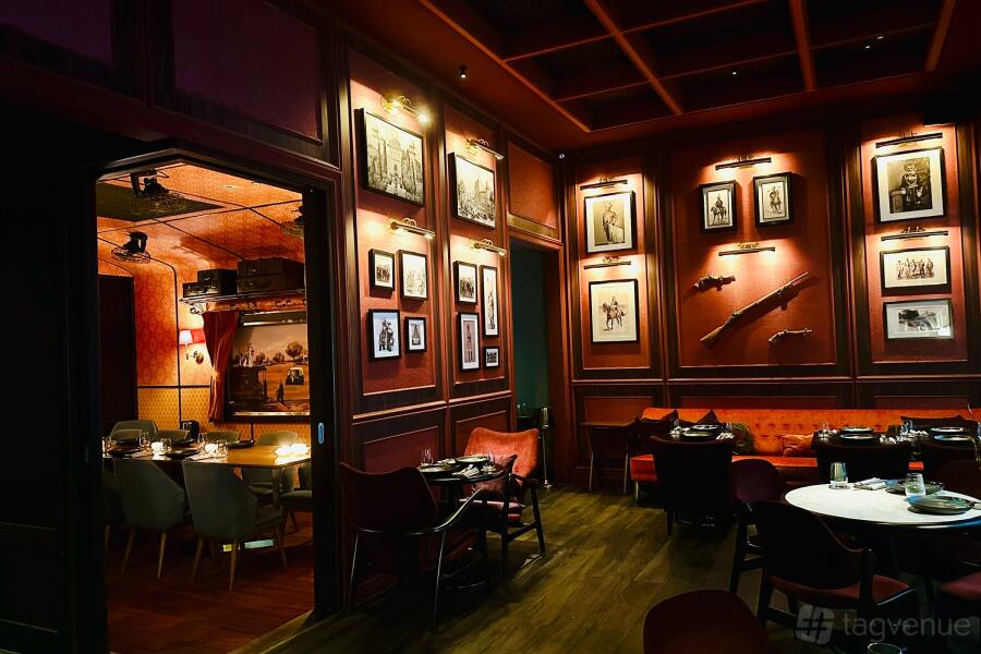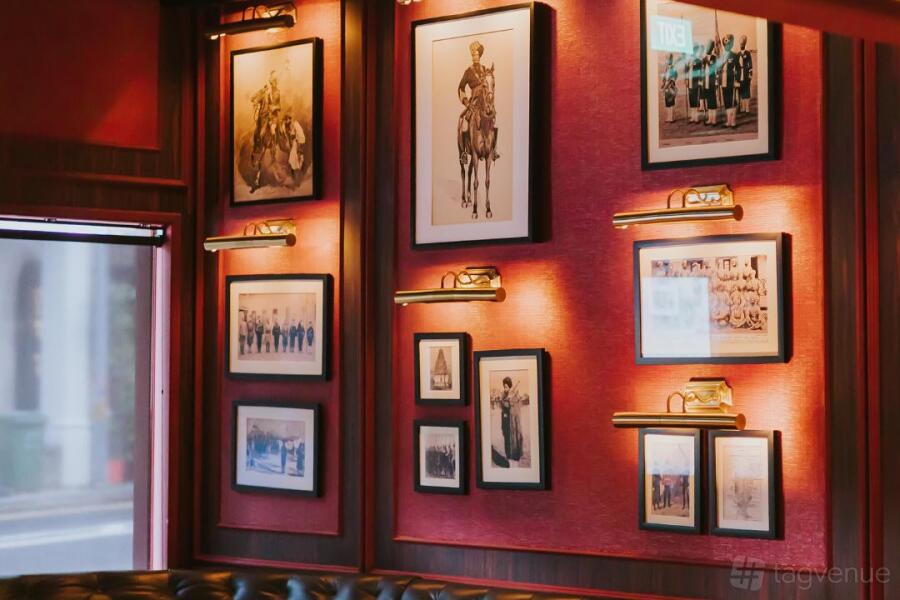 Officer's Club features a warm and sophisticated atmosphere, with dark wooden paneling and dim lighting that creates a cozy yet upscale feel. The walls are adorned with framed artworks and decorative pieces, giving the space a vintage and classic touch. The seating areas, composed of intimate tables and comfortable chairs. The combination of rich materials and carefully chosen decor makes the venue both stylish and comfortable.