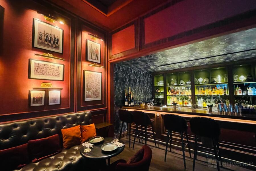 Our venue has a warm and elegant atmosphere with rich wooden walls covered in art and photographs. The lighting is soft, giving the space a cozy yet luxurious feel. The tables are set for dining, with comfortable chairs and a mix of dark wood and soft colors. There is a bar area with well-lit shelves displaying a variety of drinks, making it a great spot to relax and enjoy the ambiance.