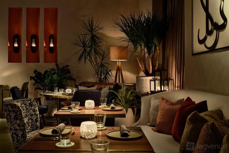 The venue is beautifully decorated with artwork on the walls and warm tones throughout. It feels open and spacious, with a nice mix of seating options, including cozy sofas and regular dining chairs. The lighting is soft and adds to the intimate, relaxed feel of the place.