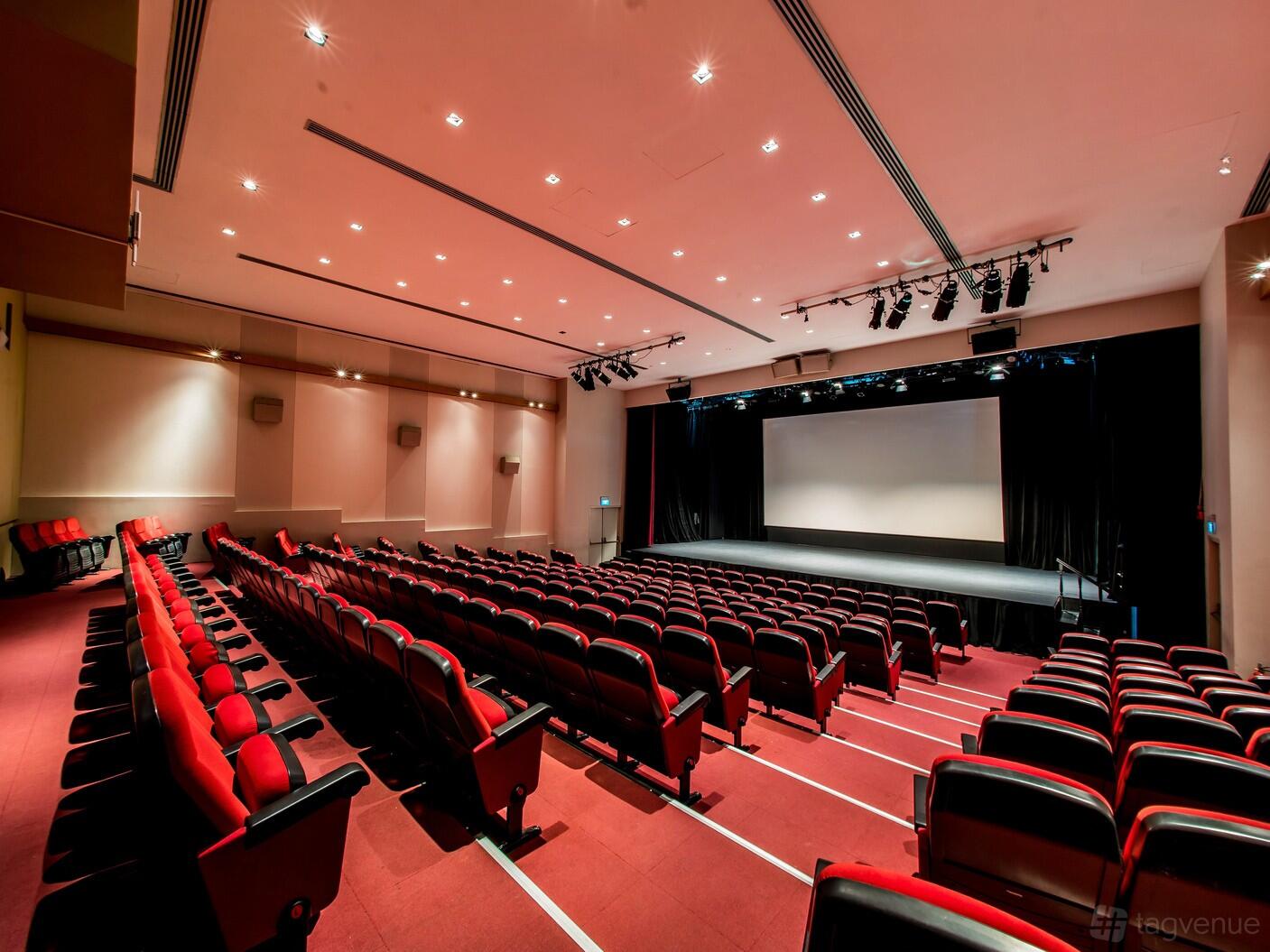 The theater has a seating capacity of up to 236 and features a large screen for digital backgrounds or movie screenings. It also has a stage suitable for theater rehearsals or performances, making it an ideal choice for various events.