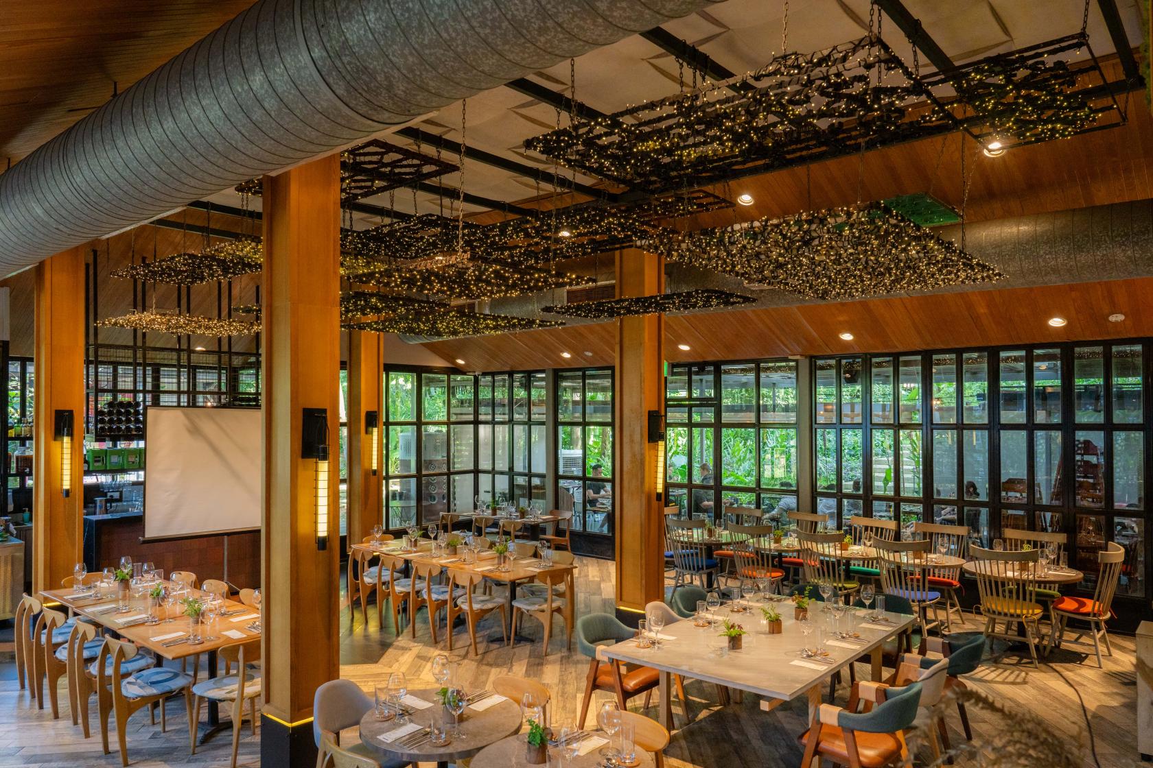 Our air-conditioned main dining space features a semi-open kitchen, high ceilings, and glass walls for a bright, elegant setting. Ideal for corporate functions, wine tastings, product launches, and birthdays, it offers flexible seating for up to 70 guests.