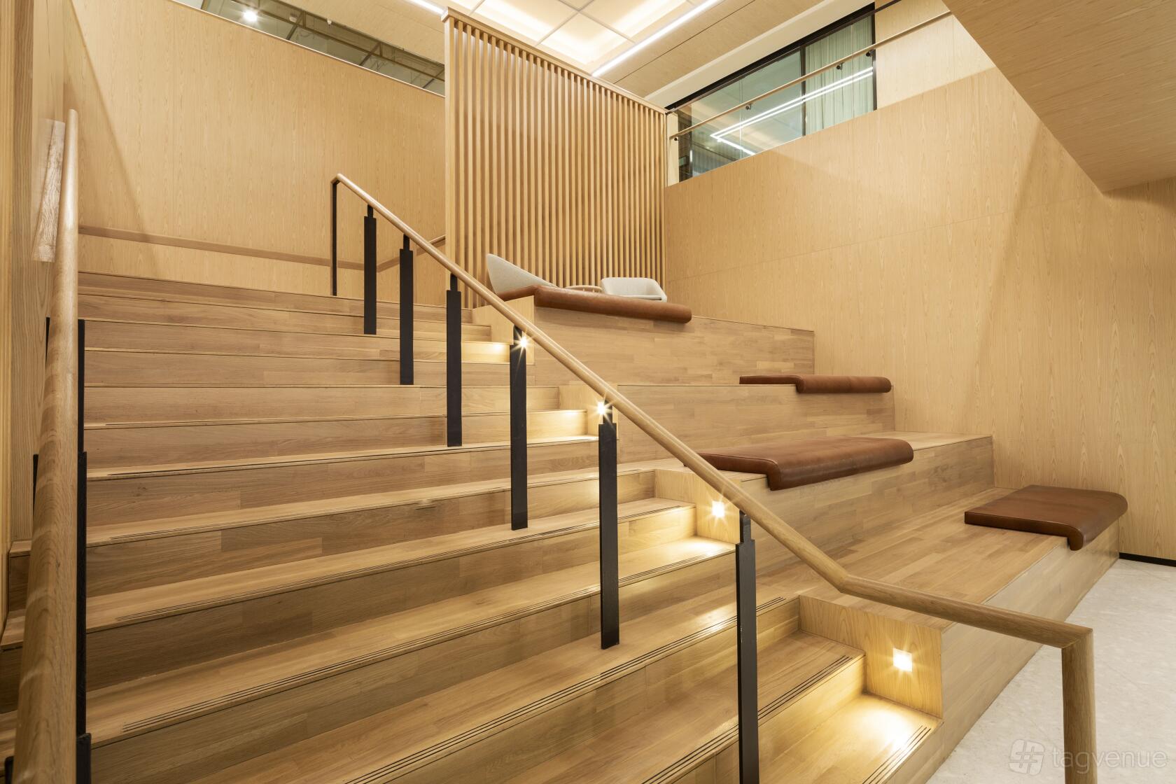 A tiered seating area for up to 60 standing or 35 seated. Wooden steps with integrated lighting and cushioned benches make a comfortable setting for presentations or workshops. The open design encourages engagement and networking.