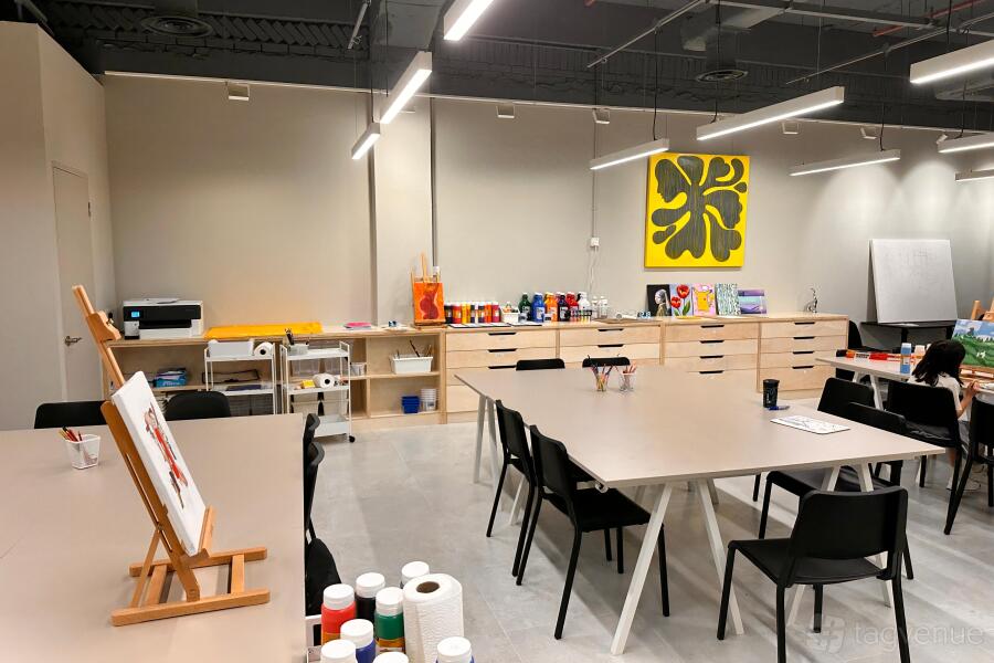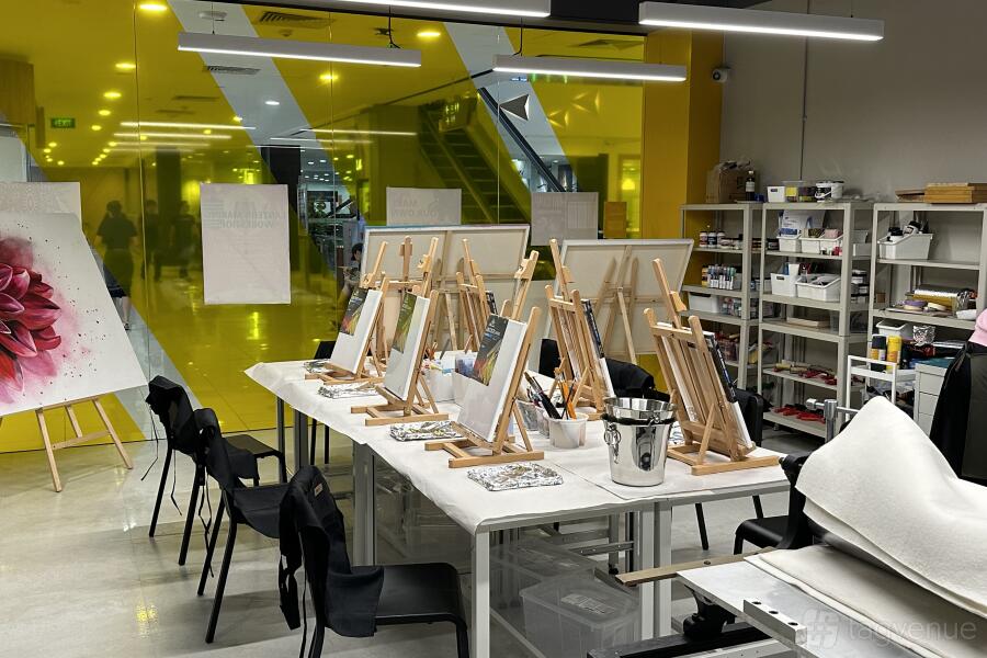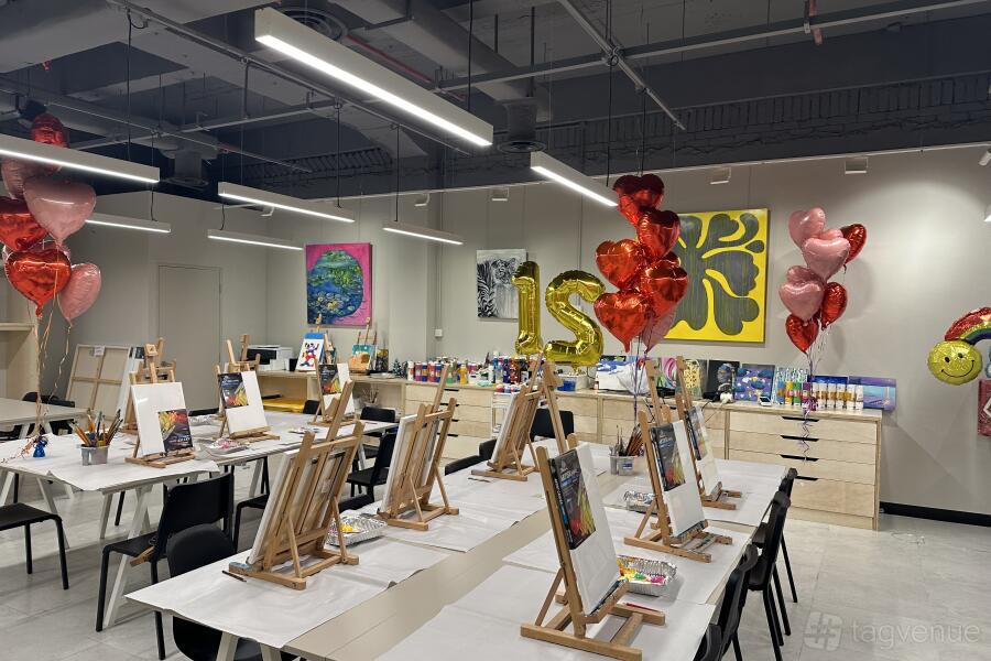 WE ART is a premium Art Studio in The Centrepoint Orchard Road. Our studio spans 1,800 square feet, featuring a main area that comfortably accommodates up to 80 people, along with a private room for up to 10 guests. We’re the perfect venue for art jamming parties, team buildings, kids birthday parties. etc.