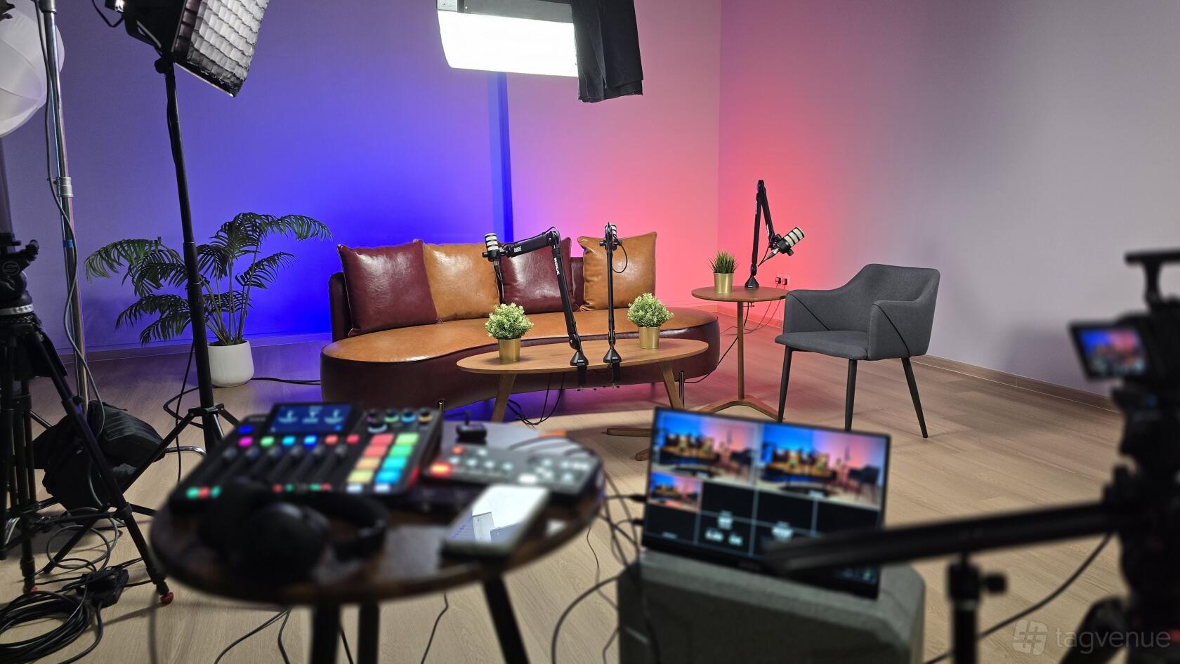 Fully customisable setup, lifestyle living room, 2 pax podcast setup in enclosed sound treated studio, RGB effect light.
