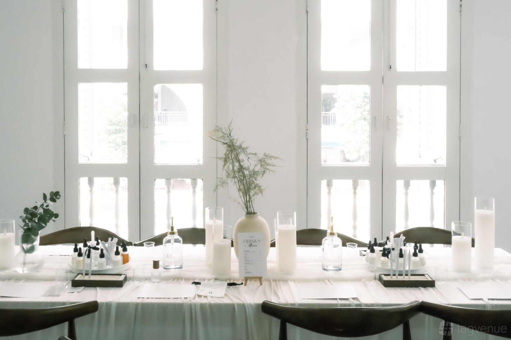Sunlight spills like liquid gold through tall arched windows, weaving calm and clarity into a sanctuary of minimalist grace. Wooden easels, seasonal florals, and tables create a charming setting ideal for art jamming, floral workshops, or creative gatherings.