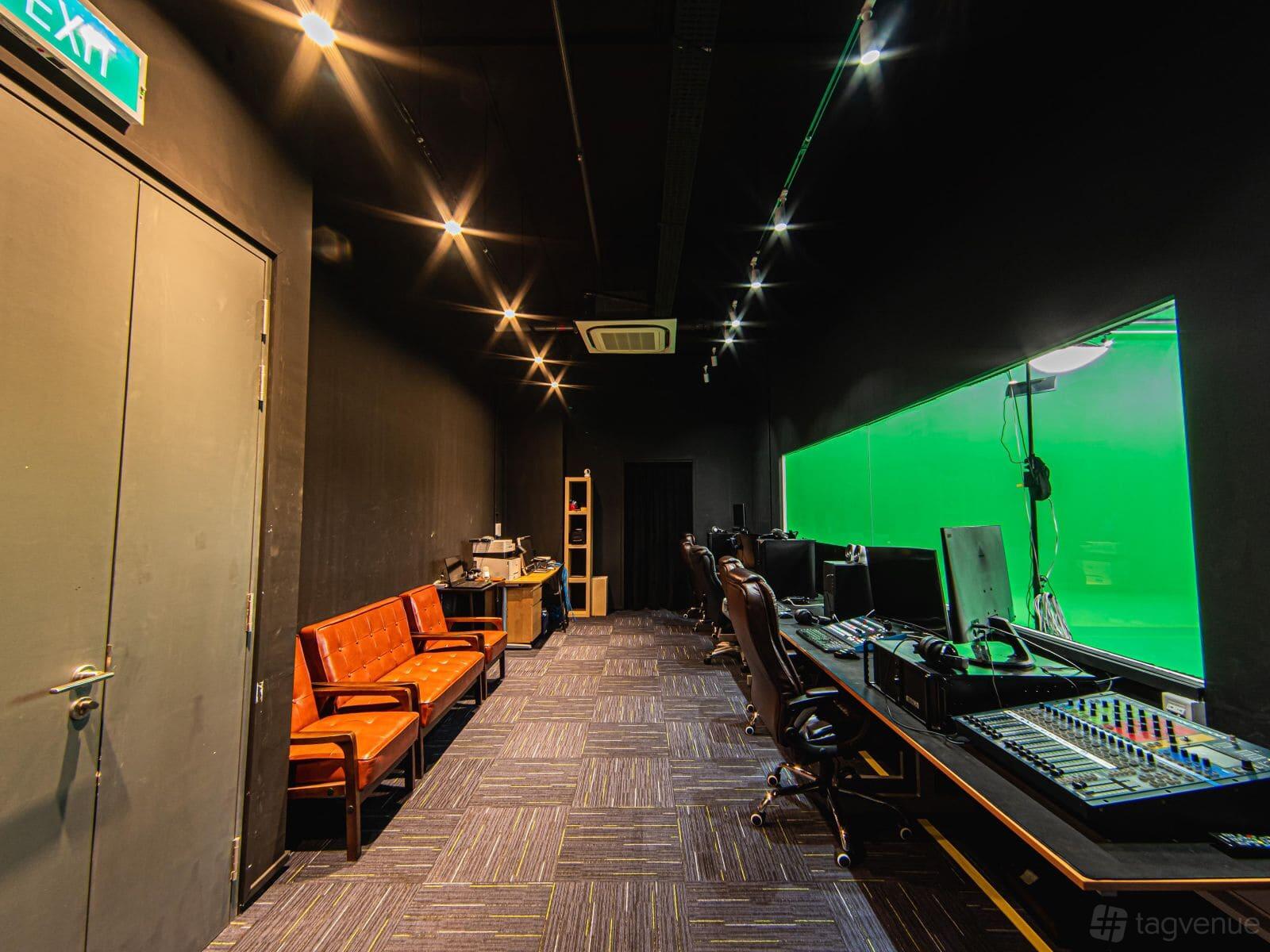 This studio has a capacity of 20 people. The space includes green screens and will be a match for commercial or podcast recording, producing social media content, or a photoshoot.
