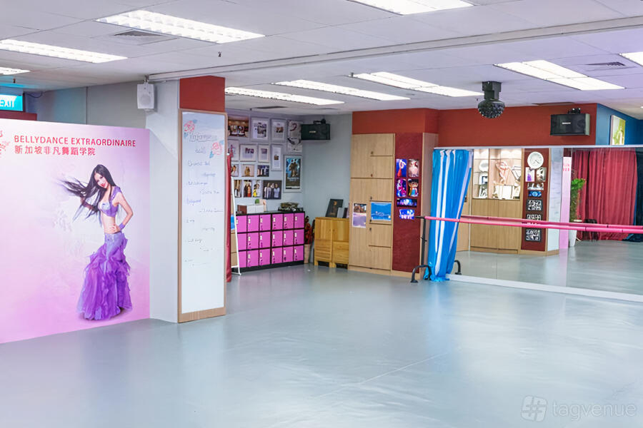 It is equipped with a professional-grade vinyl dance floor, ballet dance barre, piano, full-length mirrors, Bluetooth sound system, lockers, changing area, and smoke machine / disco lights. Fully air-conditioned, sound-proof privacy curtains, and free flow of cold/hot water and coffee. Free access to WiFi.