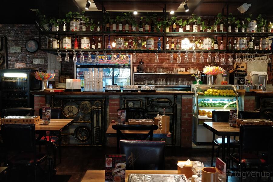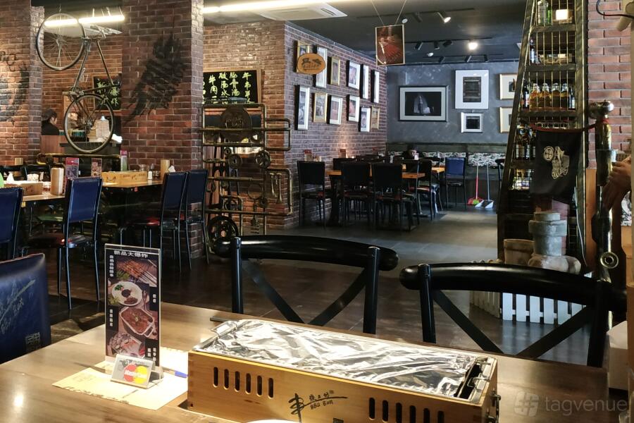 The restaurant is segmented into various areas including the main dining zone, a dedicated bar area, and private booths, all equipped with personal grills for an interactive cooking experience.