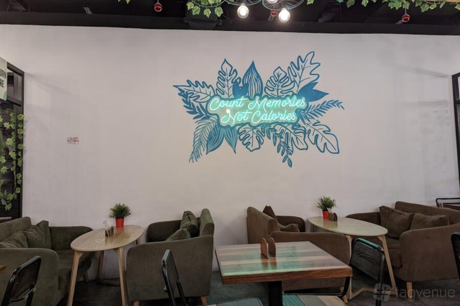 The interior boasts a modern yet rustic charm, with lush greenery, wooden accents, and soft, natural lighting that creates a warm and inviting atmosphere. The cafe is cleverly divided into cozy dining nooks and more open, communal areas, equipped with comfortable seating and free Wi-Fi, making it ideal for casual meetings or quiet work sessions.
