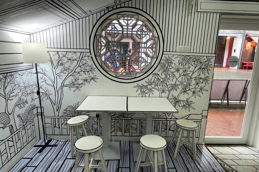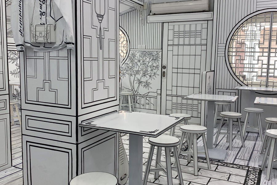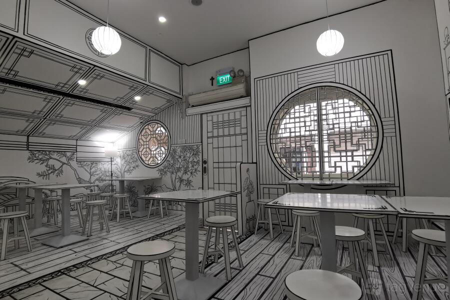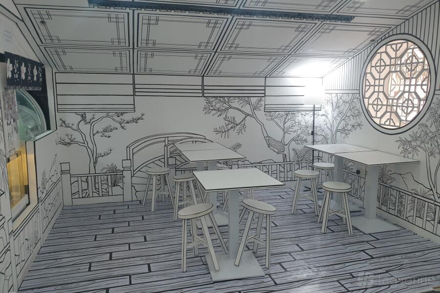 The architectural features are traditionally Chinese and have been incorporated into the two-dimensional illusion, which works to create an amazing visual paradox that plays with one's senses. Here, there are all kinds of zones, from intimate booth seating for privacy to communal tables to foster social interaction, all equipped with modern amenities for a comfortable visit.