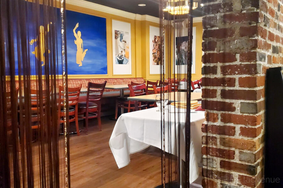 Our Main Dining has a warm and elegant atmosphere, with beautiful chandeliers hanging from the ceiling, adding a touch of luxury. The tables are set with white tablecloths and yellow napkins. The seating includes both regular tables and cozy booths, giving guests the option to sit in comfortable, private spaces. The walls are made of exposed brick.
