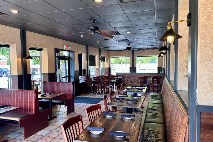 The Main Dining area at La Fiamma Italian Kitchen is warm and inviting, featuring classic wooden furniture and framed artwork that adds a touch of Italian culture. Soft, recessed lighting complements the natural light, creating a cozy ambiance.