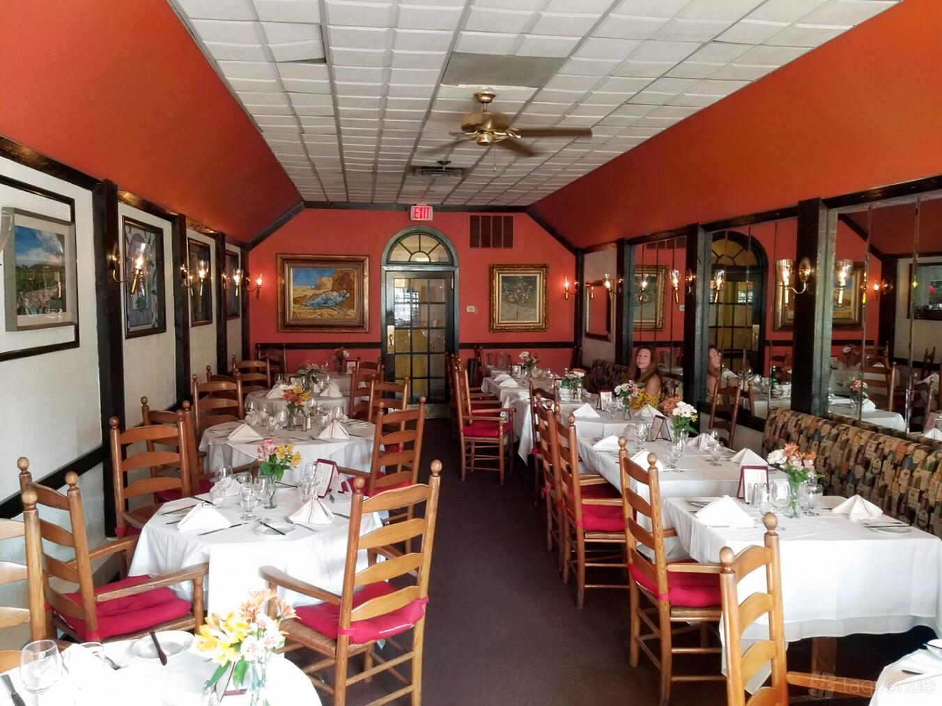 The Main Dining Room at La Côte D'Or Café accommodates up to 50 guests. It features red and white walls, with multiple paintings and strategically placed mirrors enhancing the ambiance.