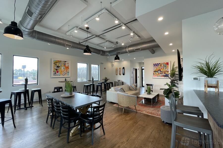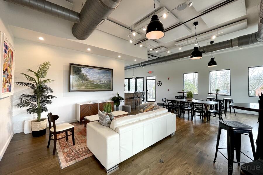 ‘The loft’ at Paper Plane is an inviting and open modern industrial loft space that sits atop Paper Plane's full Sevice restaurant in Hapeville, GA. Looking down the quaint Main Street of downtown Hapeville, the loft is well-appointed with a walkout patio, bar area, lounge seating, and large-screen TV.