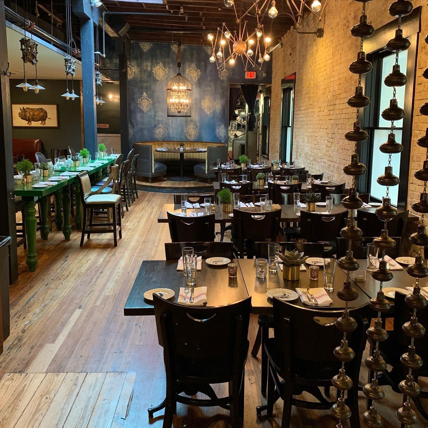 The Dining Room at Swift's Attic has a moody, elegant vibe. Brick walls, soft lighting, and dark wood tables set a warm tone. There’s a long green table near the back and booth seating tucked into corners. The blue accent wall with gold detail adds a bold touch. It’s a quiet, polished space for dinners and small celebrations.
