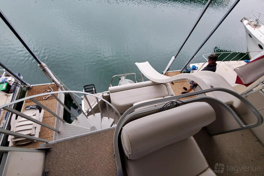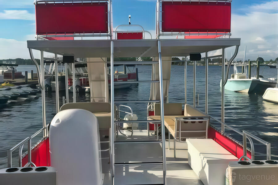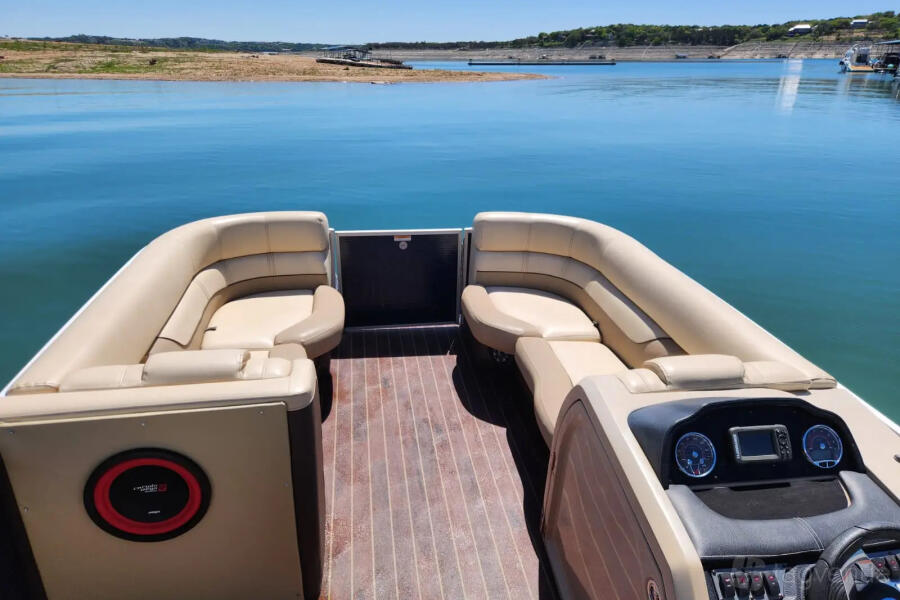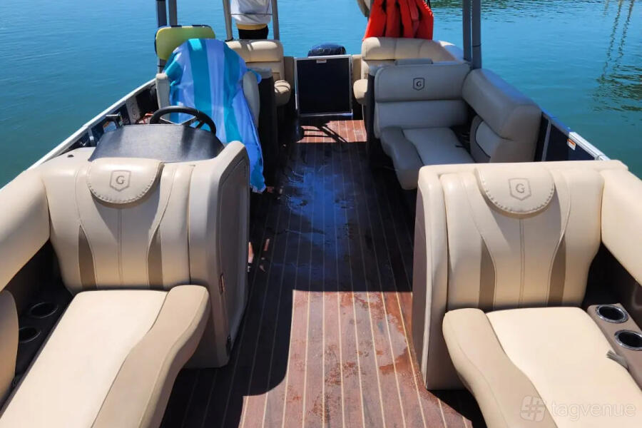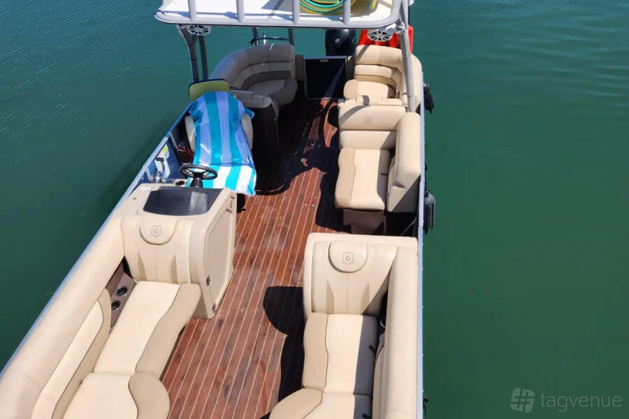 The 24ft Luxury Tritoon is sleek and roomy. It fits up to 12 people. The ride is calm, even on waves. There’s a Bluetooth stereo for music. Seats are soft and spacious. A big Bimini top gives shade. Great for cruising or swimming. Easy to board. Perfect for calm days with friends or family.
