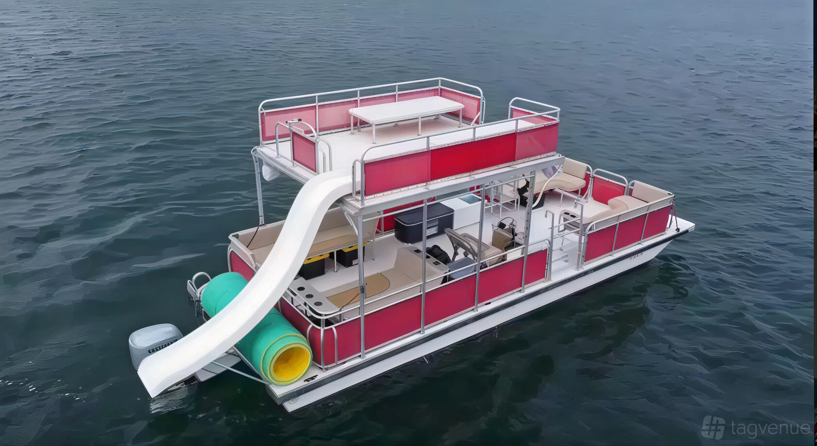 henanigans is a 33ft double-deck tritoon built for a good time. It’s roomy, stable, and easy to cruise. The upper deck gives you a view. The slide brings you straight into the water. One slide available. Down below, soft seating wraps around the boat. There’s a Bluetooth stereo for your playlist.