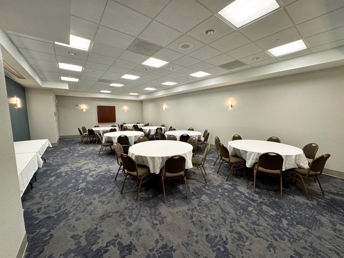 The Illinois Room can accommodate up to 60 guests. It is intended for meetings, training sessions, and business events. The space includes AV equipment and Wi-Fi, and we can arrange special prices for groups of any size.