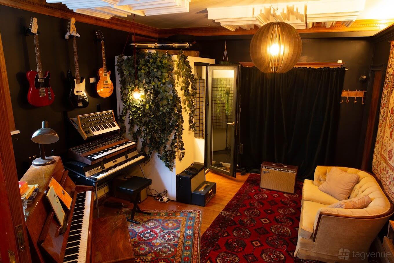 This 450 sq ft recording studio in Williamsburg, Brooklyn, combines function and comfort to create an inspiring space for music and creativity. With rich wooden floors, vintage rugs, and walls adorned with instruments, the room exudes a cozy, inviting vibe. Natural light and warm-toned lighting enhance the relaxed atmosphere. The studio includes a soundproofed booth, an upright piano, and a fully equipped recording desk, perfect for solo or group sessions. Guests also have access to a lounge, kitchen, bathroom, and an outdoor deck connected to the studio.