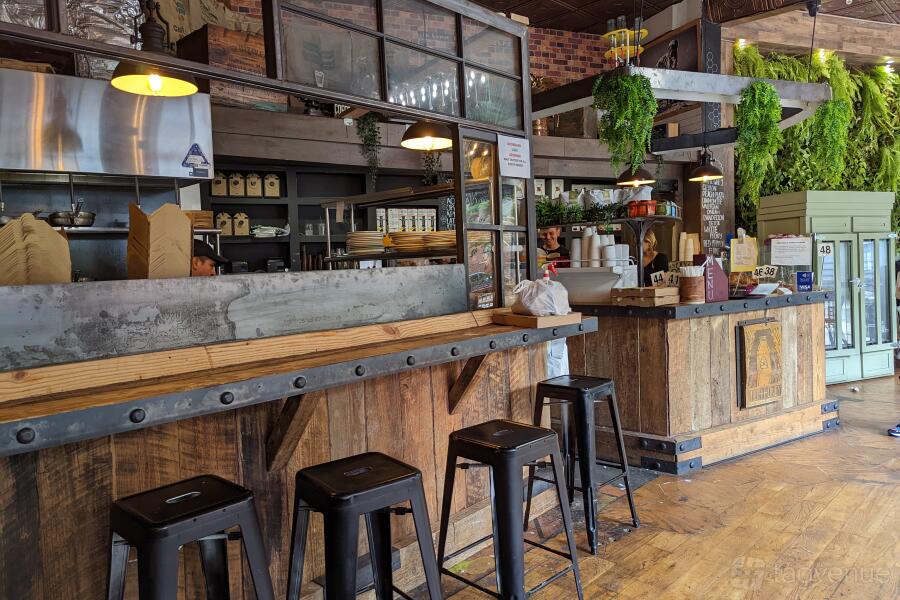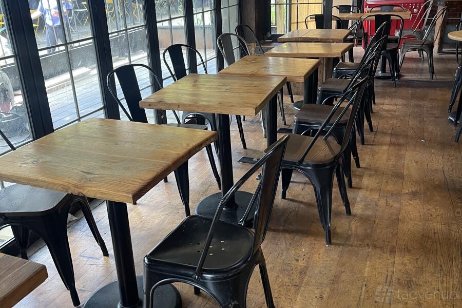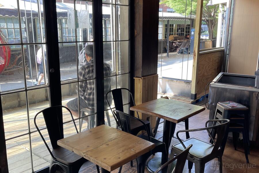 Our second area is approximately 750 sqft and seats up to 50 guests. Surrounded by floor-to-ceiling windows, it provides an airy, sunlit atmosphere with an outdoor-like feel while remaining sheltered. The mismatched tile flooring and greenery hanging from the ceiling create a relaxed and stylish ambiance.