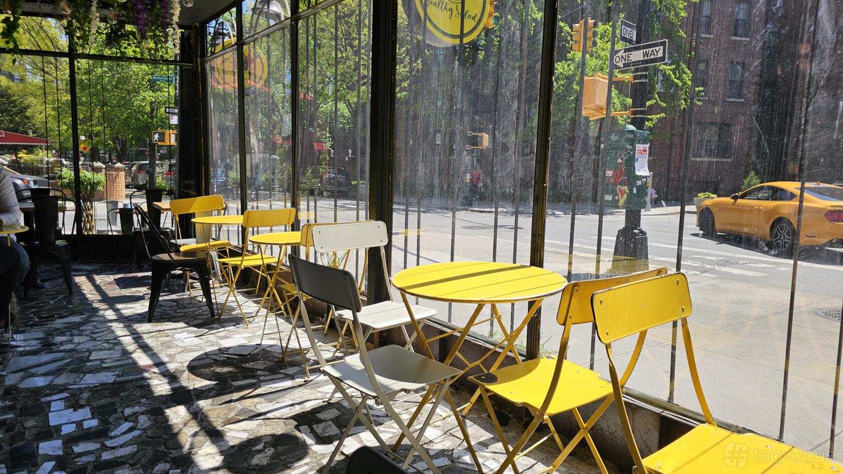 Yellow bistro-style tables and chairs add a playful touch, making this space perfect for intimate gatherings, coffee meetups, or casual dining. The neighborhood is open to view, adding a lot of beauty, making it very unique and inviting.