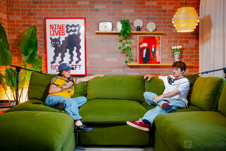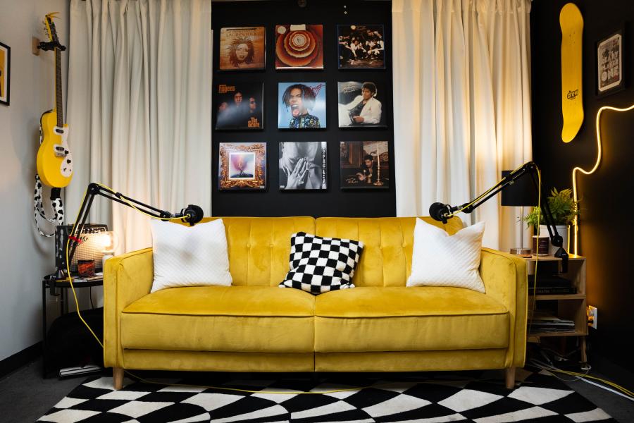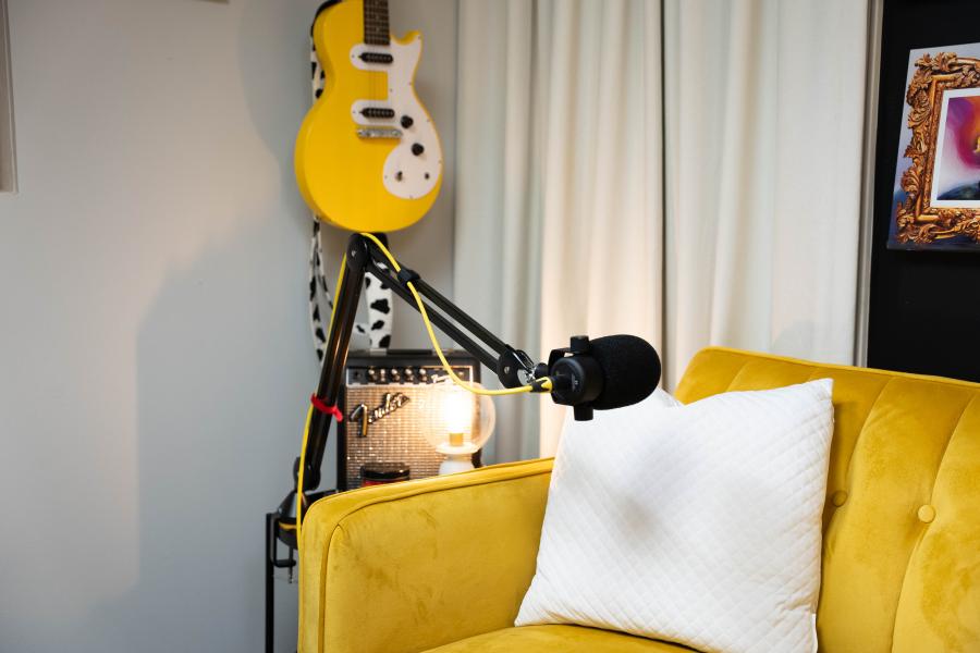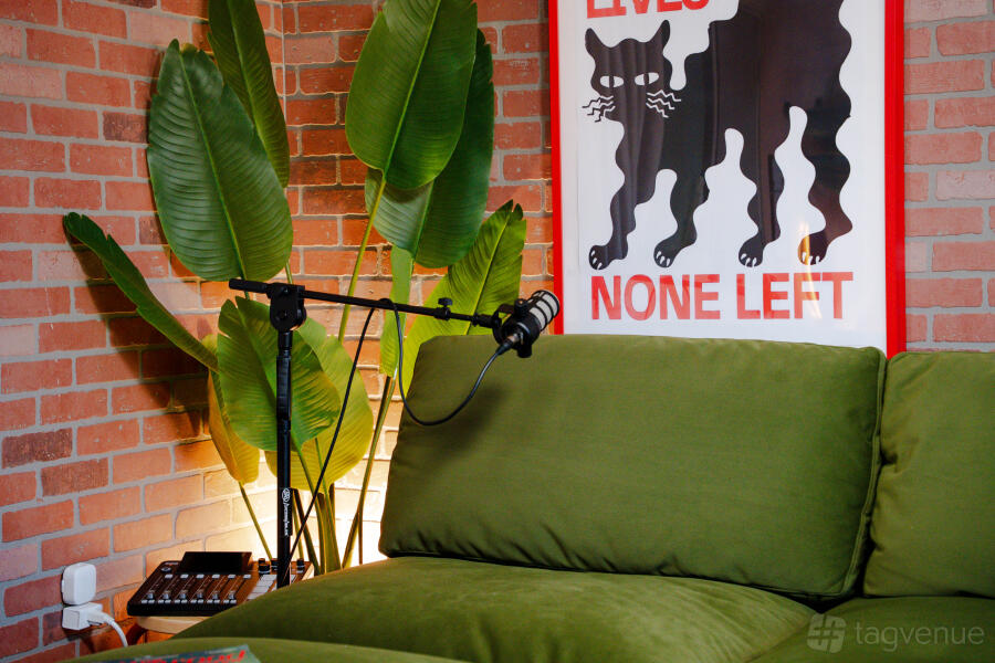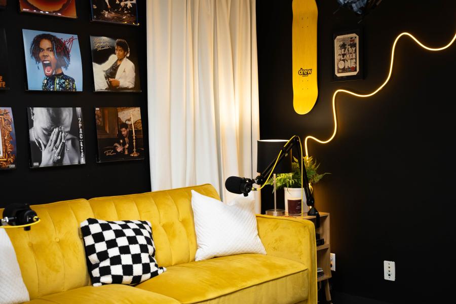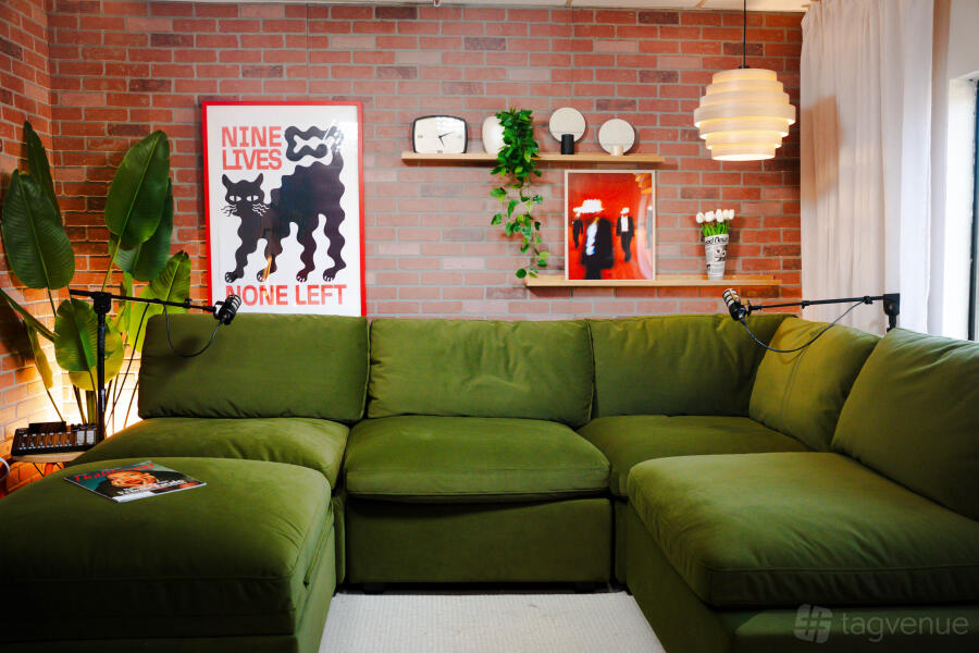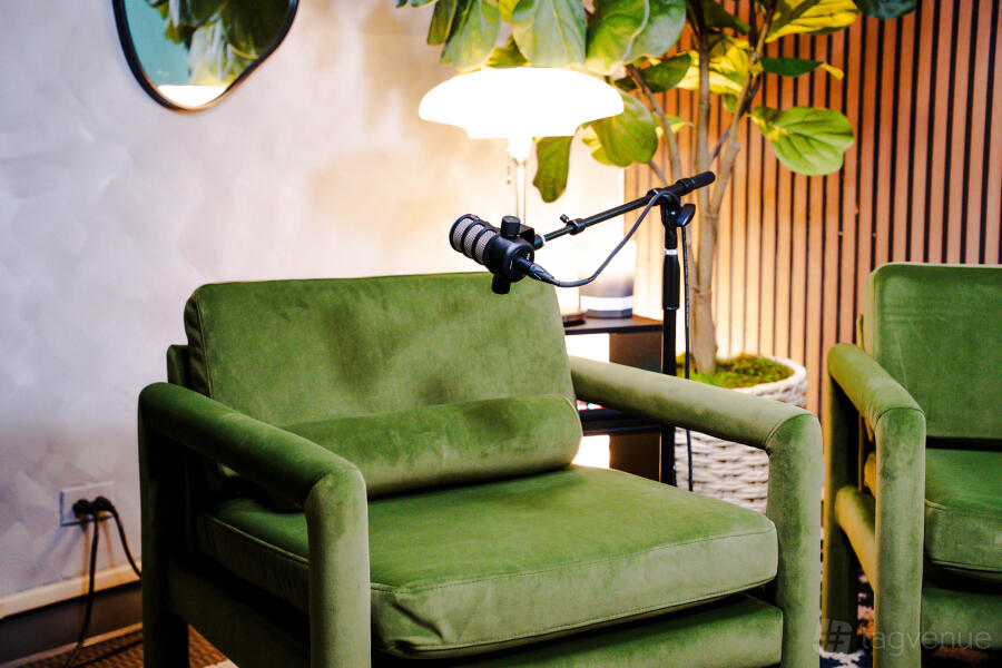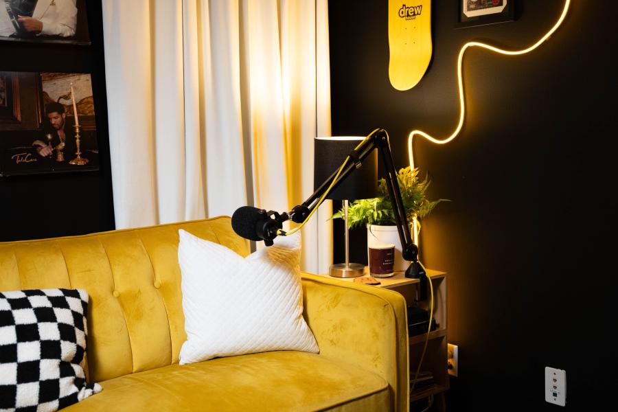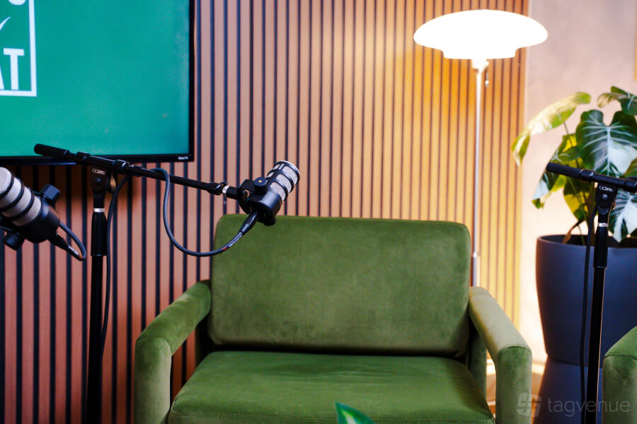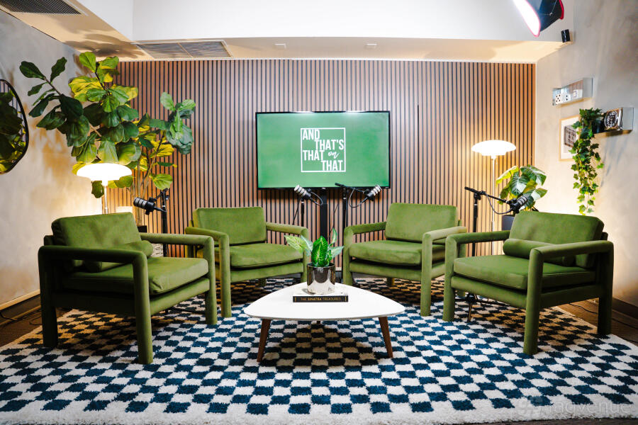 The space is pre-lit and equipped with high-quality microphones, ensuring top-notch audio recording. With customizable set options, The Powder Room is ideal for creating a personalized and professional podcasting environment. The thoughtful design details make it both functional and visually appealing.