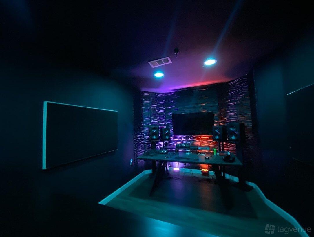 Studio C at Studio Compound DMV is ideal for creative projects or music recording. Its vibrant LED lighting with black walls create a dynamic atmosphere, while screens support visual displays.