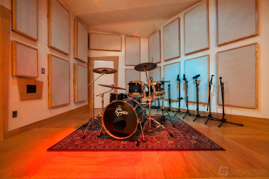 The studio's design emphasizes both functionality and aesthetic appeal, with vibrant color contrasts, soundproof panels, and decorative elements that create a comfortable, inspiring atmosphere. Optimal acoustic treatments ensure that every note is captured with clarity, making Studio B a perfect spot for high-quality recording sessions.