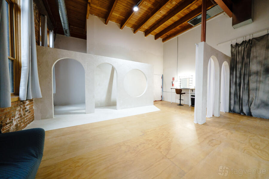 Each Studio Features make up station with vanity mirror and two stools, mini fridge, speaker, changing area (tent, curtains or screen), 1 x clothing rack, 2 x tables (4' or 6'), sofa/couch/seating, free Wi-Fi.