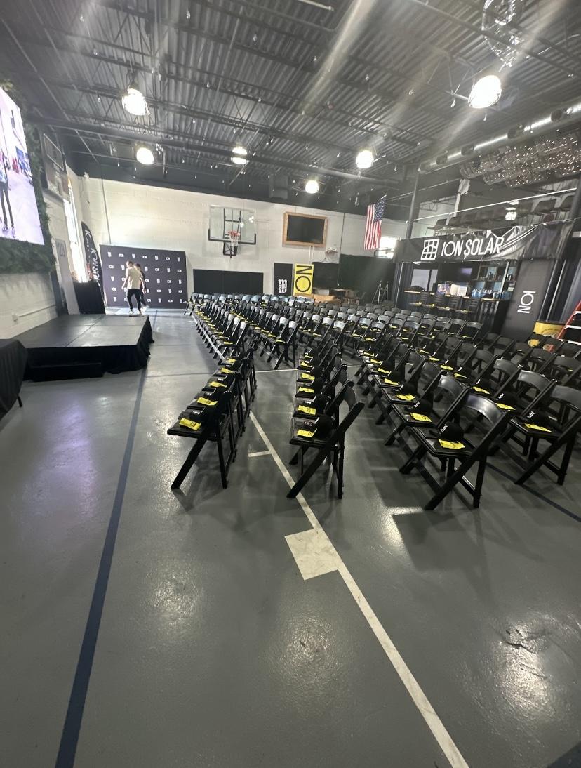 Depending on the event, we offer several different layout options within our space. With our full basketball court, the space can remain open for activities, or we can have tables, couches, and chairs for seating. The space has a container bar with seating for eight and a second level over the bar that overlooks the entire space.