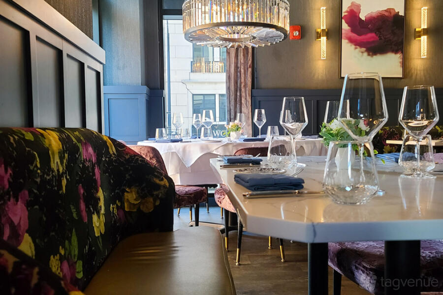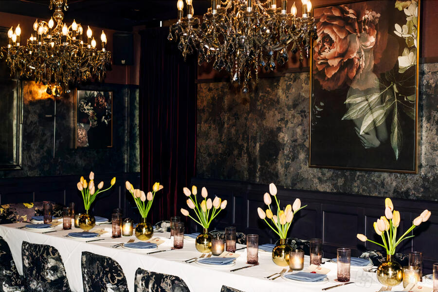The Dahlia Room at Adalina offers an intimate yet elegant setting for both seated and standing events. This refined space features a rich interior design with soft lighting, luxurious seating, and beautiful chandeliers, making it ideal for smaller gatherings. With a capacity of 26 seated or 40 standing, it provides flexibility for various event formats, from formal dinners to cocktail-style receptions.