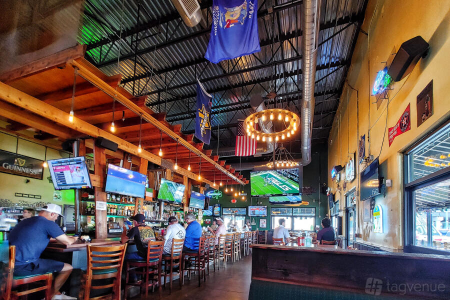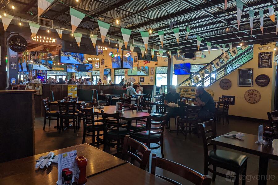 An expansive overhang provides shade and shelter, ensuring the patio is enjoyable in any weather, adorned with festive lighting and lively décor that encapsulates the spirit of a true Irish pub. Large screens strategically placed ensure guests don’t miss any sports action, making it an ideal spot for game days.
