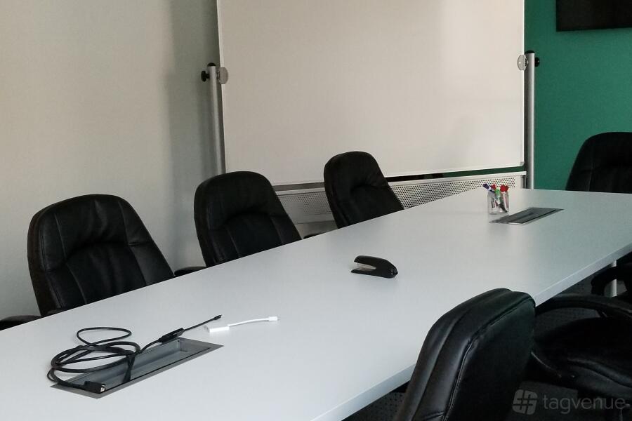 This conference room trades a large boardroom table for a smaller round table with seating for up to 4, while still giving you access to all the amenities you might need.